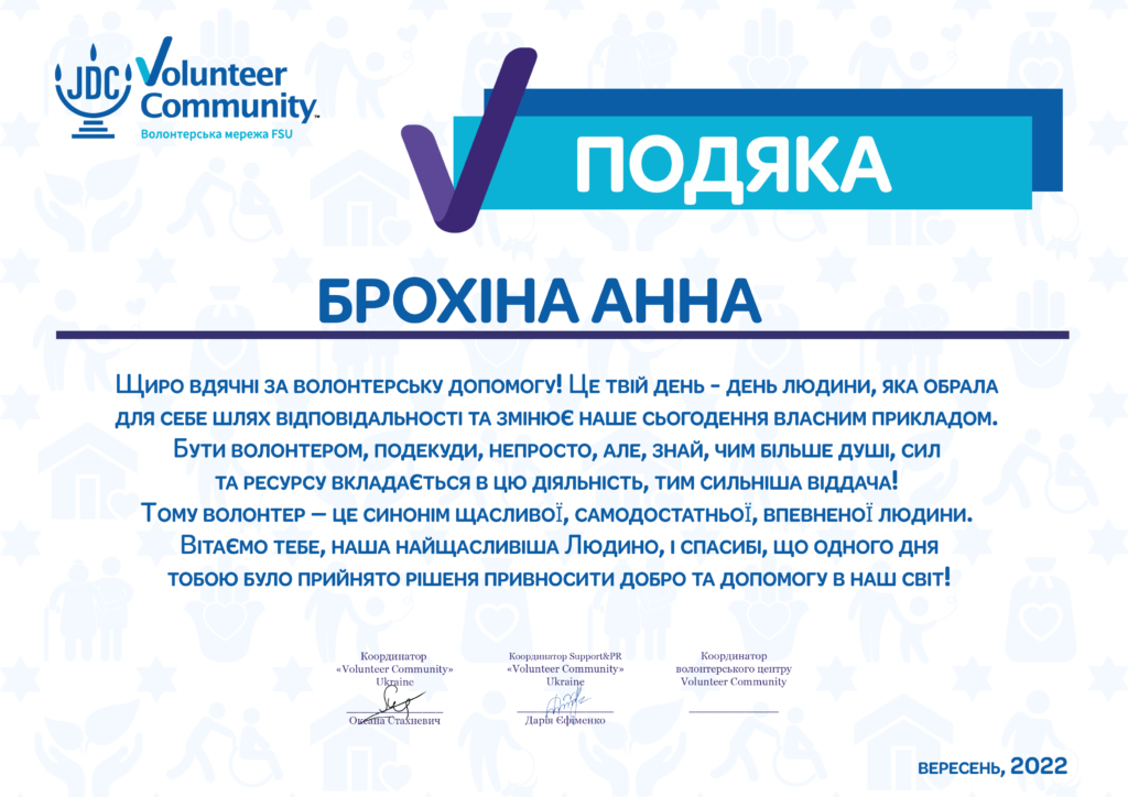 Дякуємо: доцента Петренко Тетяну Вячеславівну, доцента Городиську Юлію Петрівну, Брохіну Анну (СР217), Бугай Ірину (СР-216), Владімірова Віктора-Владислава (СР516), Гаврилюк Оксану (СР216), Гайтан Юлію (СР316), Хацько Єлізавету (СР416), Ковальову Софію (СР116), Козлову Вероніку (СР216), Олійник Святослава (СР217), Толстих Яну (СР116), Фортельну Аліну (СР316), Чесановську Софію (СР516), Шугай Євгенію (СР416)