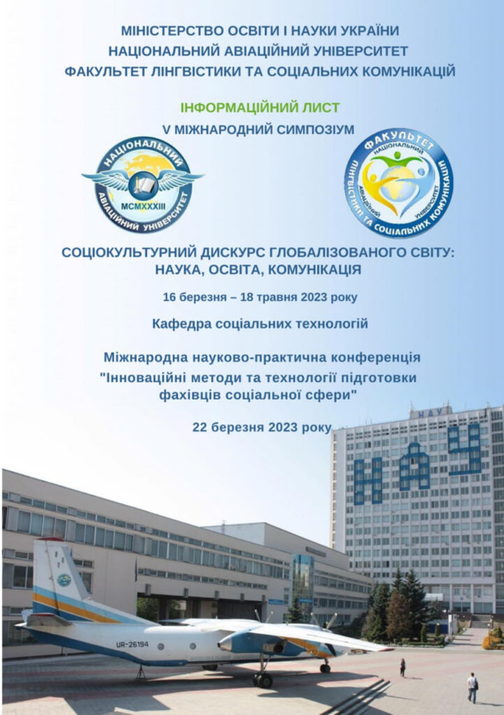 Кафедра соціальних технологій нагадує, що 22 березня 2023 року з 12-00 до 17-00 год відбудеться Міжнародна науково-практична конференція “Інноваційні методи та технології підготовки фахівців соціальної сфери” (онлайн) в рамках V Міжнародного симпозіуму “Соціокультурний дискурс глобалізованого світу: наука, освіта, комунікація”