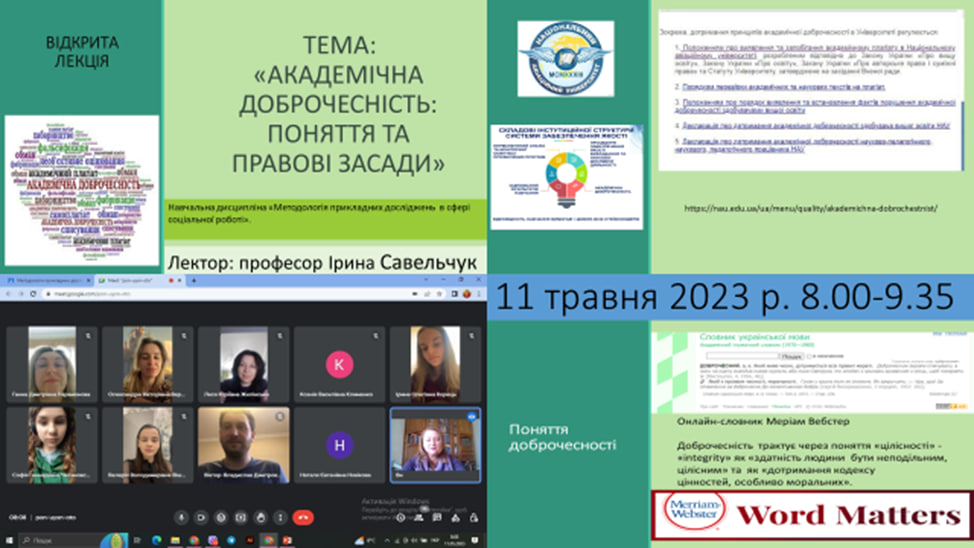 11 травня 2023 року на кафедрі соціальних технологій Факультету лінгвістики та соціальних комунікацій НАУ відбулася відкрита онлайн лекція на тему: «Академічна доброчесність: поняття та правові засади» з навчальної дисципліни «Методологія прикладних досліджень у сфері соціальної роботи» для здобувачів 1-го року навчання другого (магістерського) рівня вищої освіти ОП «Соціальна робота», денної форми навчання.