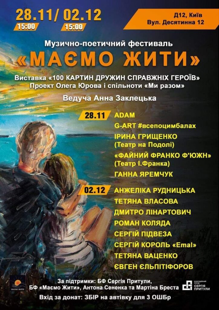 Музично-поетичний фестиваль “Маємо жити”* буде проходити з 28 листопада по 7 грудня за адресою: м. Київ, вул. Десятинна 12.