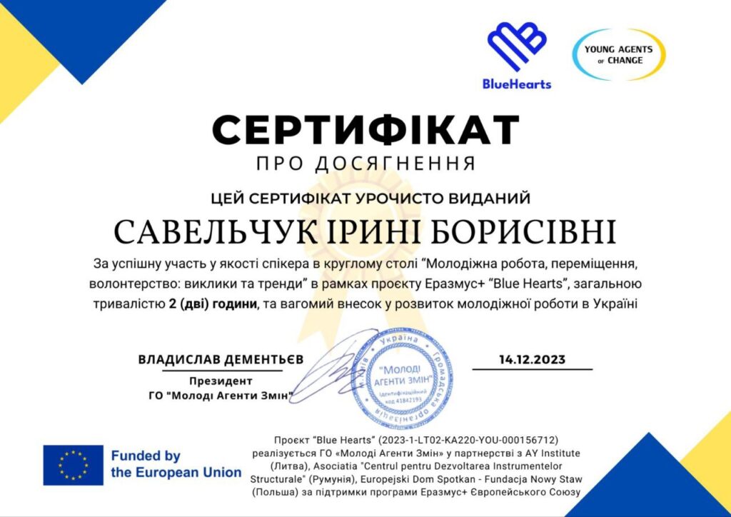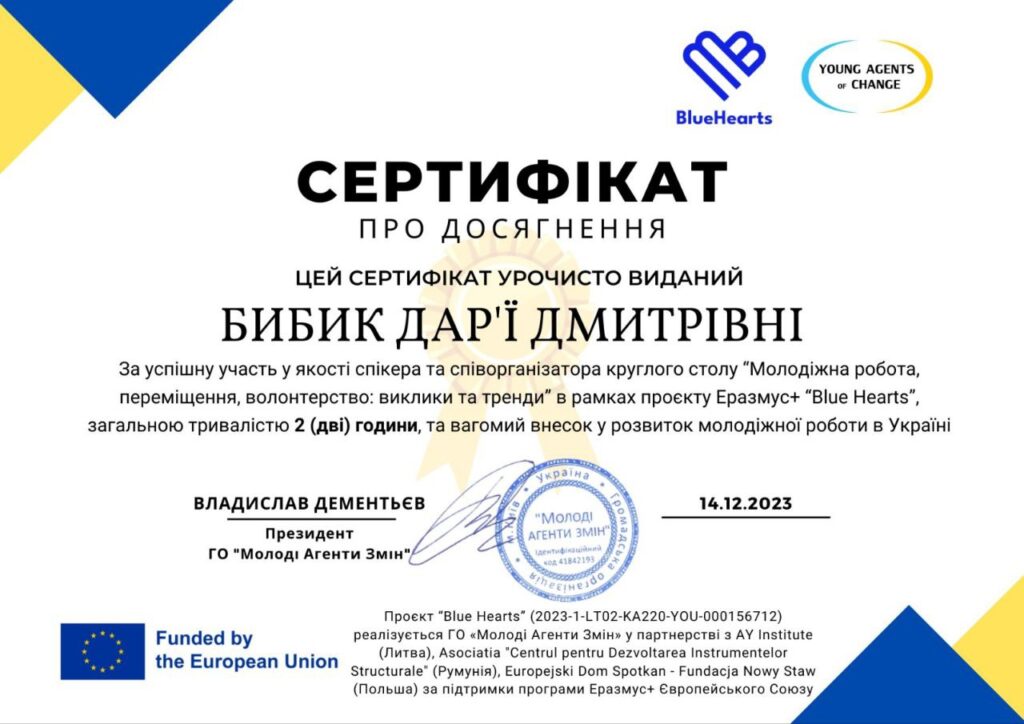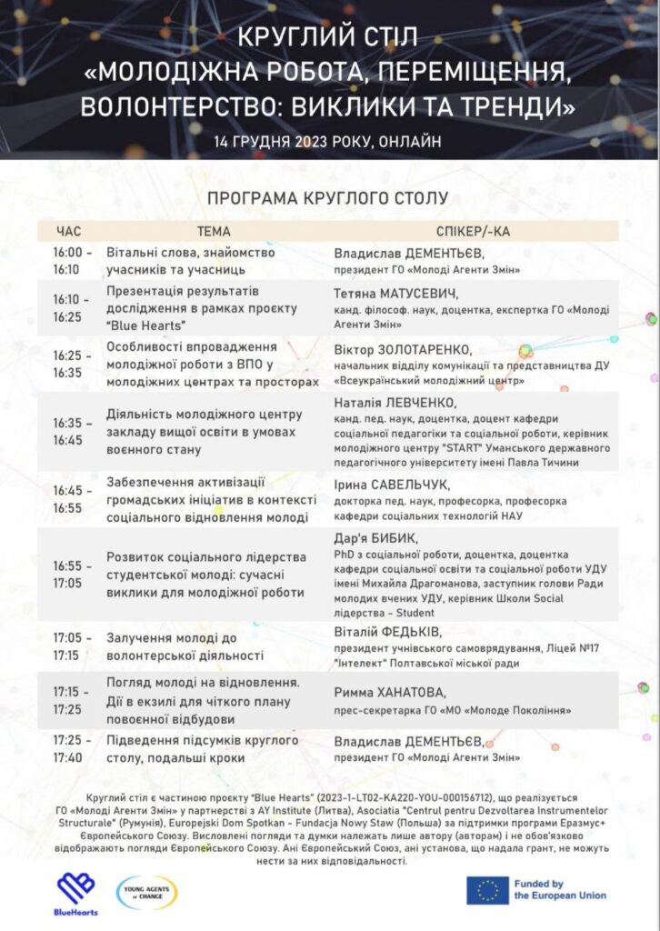 Круглий стіл є частиною проєкту “Blue Hearts” (2023-1-LT02-KA220-YOU-000156712), що реалізується ГО «Молоді Агенти Змін» у партнерстві з AY Institute (Литва), Asociatia “Centrul pentru Dezvoltarea Instrumentelor Structurale” (Румунія), Europejski Dom Spotkan – Fundacja Nowy Staw (Польша) за підтримки програми Еразмус+ Європейського Союзу.