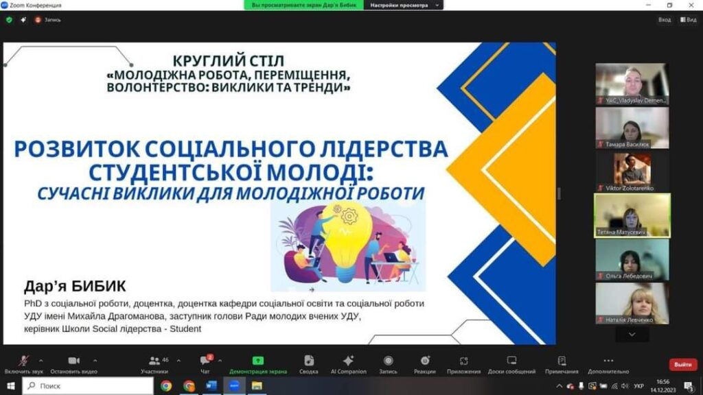 14 грудня 2023 року відбувся круглий стіл “Молодіжна робота, переміщення, волонтерство: виклики та тренди”, спікерами на якому виступили представники кафедри соціальних технологій Національного авіаційного університету – доктор педагогічних наук, проф. Ірина САВЕЛЬЧУК та доктор філософії в галузі соціальної роботи, доц. Дар’я БИБИК.