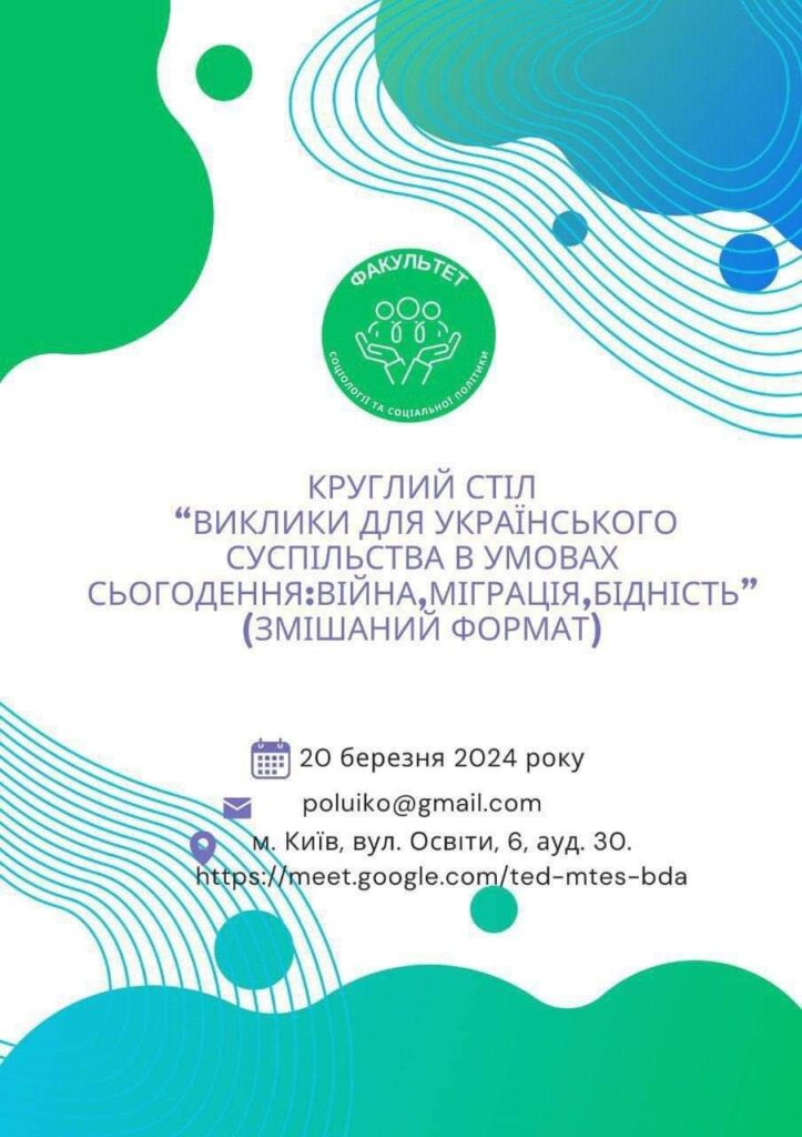 У Вас є чудова можливість взяти участь у круглому столі “Виклики для українського суспільства в умовах сьогодення:війна,міграція,бідність”, який відбудеться 20 березня 2024 року (змішаний формат).