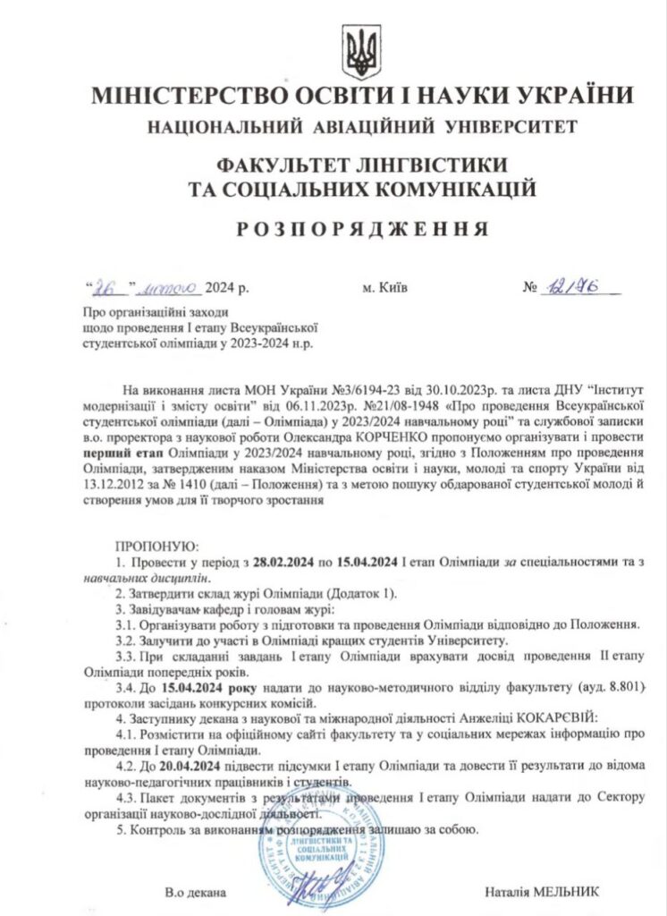 10 квітня 2024 року о 12.00 відбудеться Всеукраїнська студентська олімпіада, І тур, яка об’єднає студентів для змагань у галузі їхніх академічних знань і вмінь.