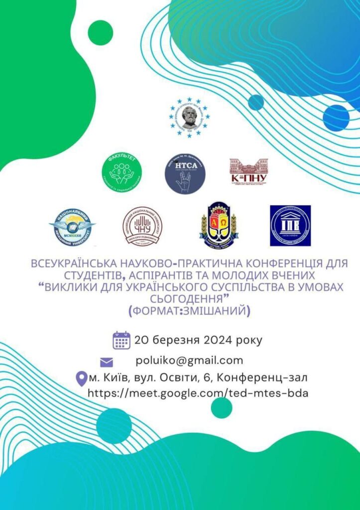 Наступного дня, 20 березня 2024 року, відбудеться Всеукраїнська науково-практична конференція для студентів, аспірантів та молодих вчених “Виклики для українського суспільства в умовах сьогодення” у змішаному форматі. Конференція надасть платформу для обговорення актуальних соціальних, економічних та політичних питань.