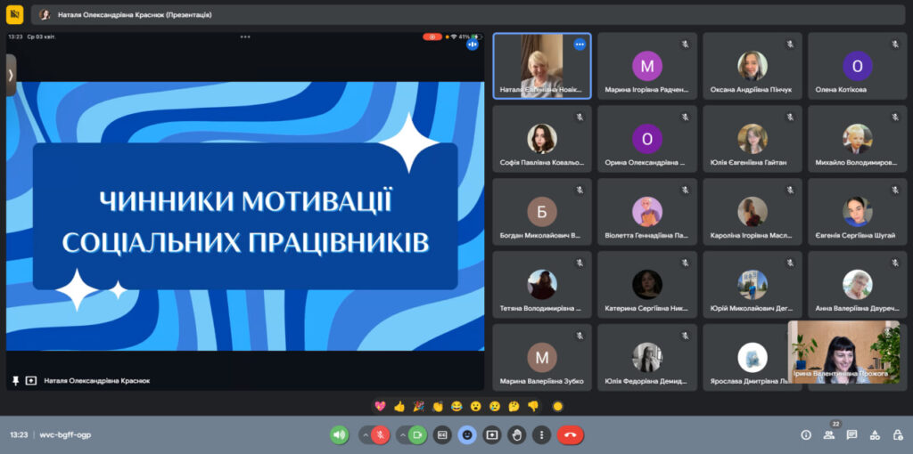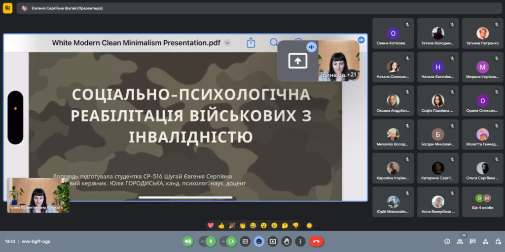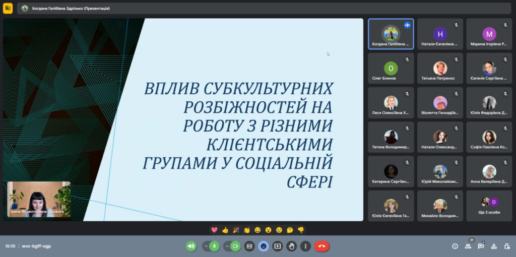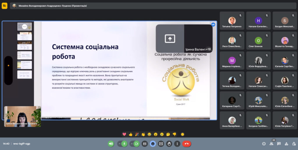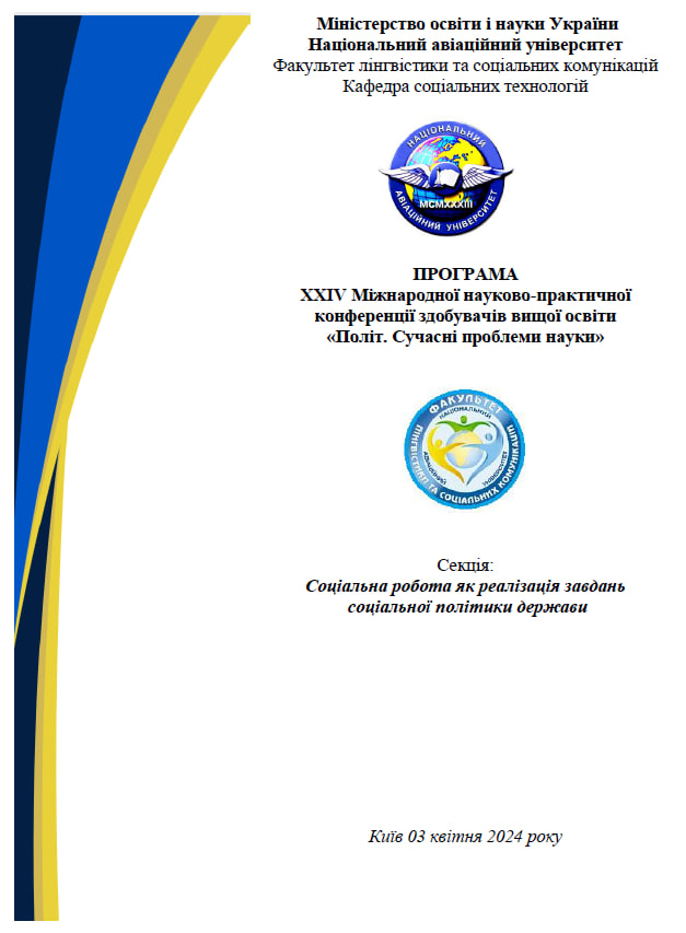 На секційному засіданні свої доповіді представили молоді дослідники з Національного авіаційного університету Факультету лінгвістики та соціальних комунікацій кафедри соціальних технологій та Держаного університету інформаційно-комунікаційних технологій. Було представлено ряд актуальних доповідей, серед яких обговорювалися питання соціально-психологічної реабілітації, інноваційних підходів у соціальній роботі, переваг інклюзивної освіти, а також допомоги та підтримки в часи війни. Модерувала секційне засідання доцент Ірина Прожога.