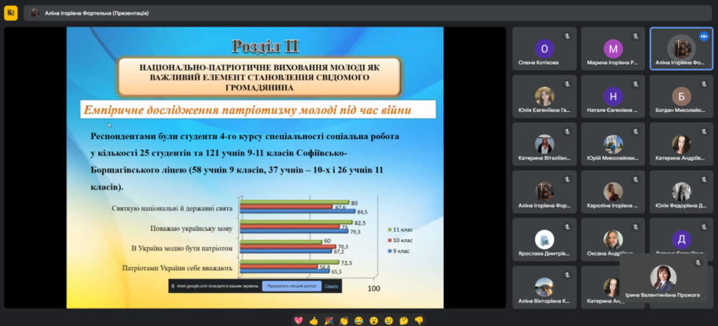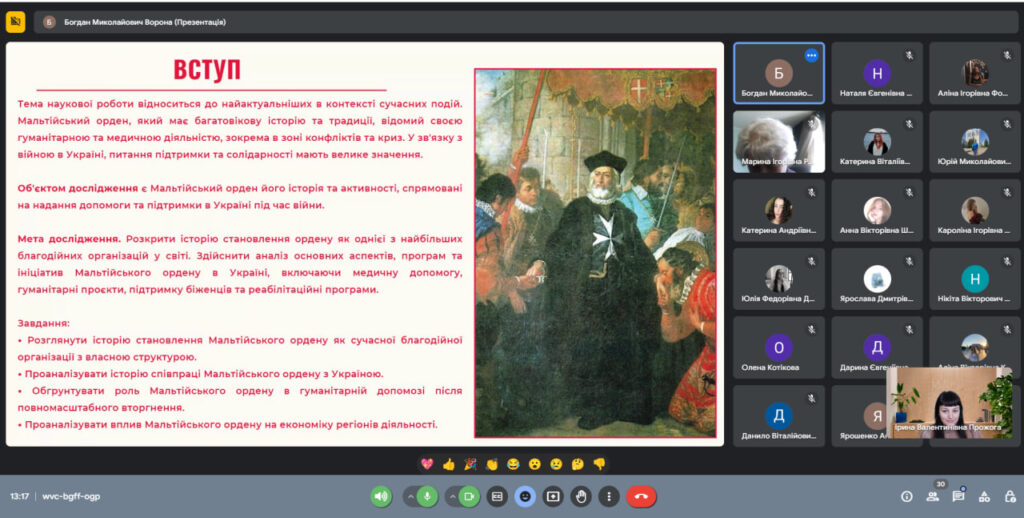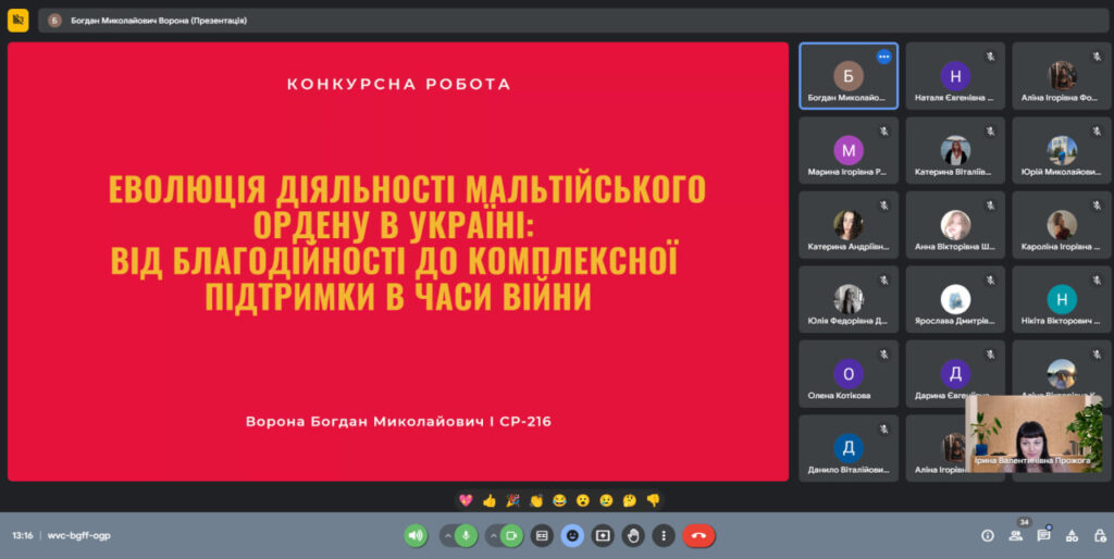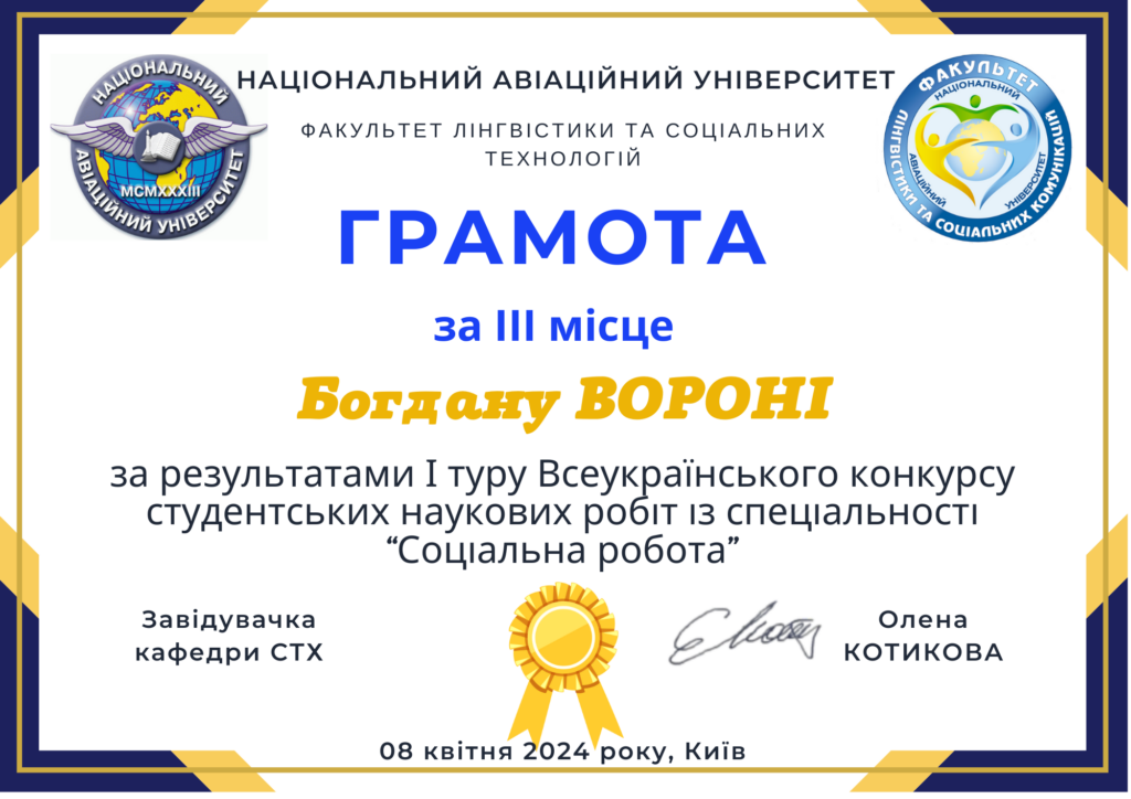 Третє місце поділили Аліна Фортельна з роботою “Національно-патріотичне виховання молоді під час війни” (науковий керівник: старший викладач кафедри Новікова Наталя Євгенівна) та Богдан Ворона з дослідженням “Еволюція діяльності Мальтійського ордену в Україні: від благодійності до комплексної підтримки в часи війни” (науковий керівник доцент, кандидат економічних наук, Прожога Ірина Валентинівна), які обидва висвітлили актуальні соціальні теми та внесок у розвиток соціальної роботи в Україні.