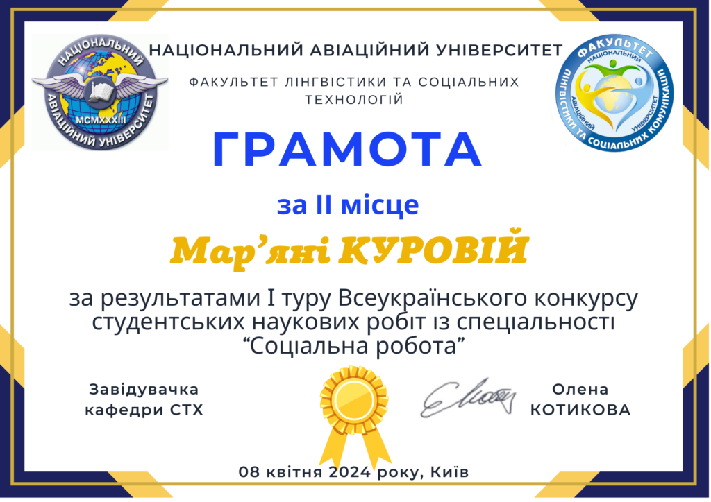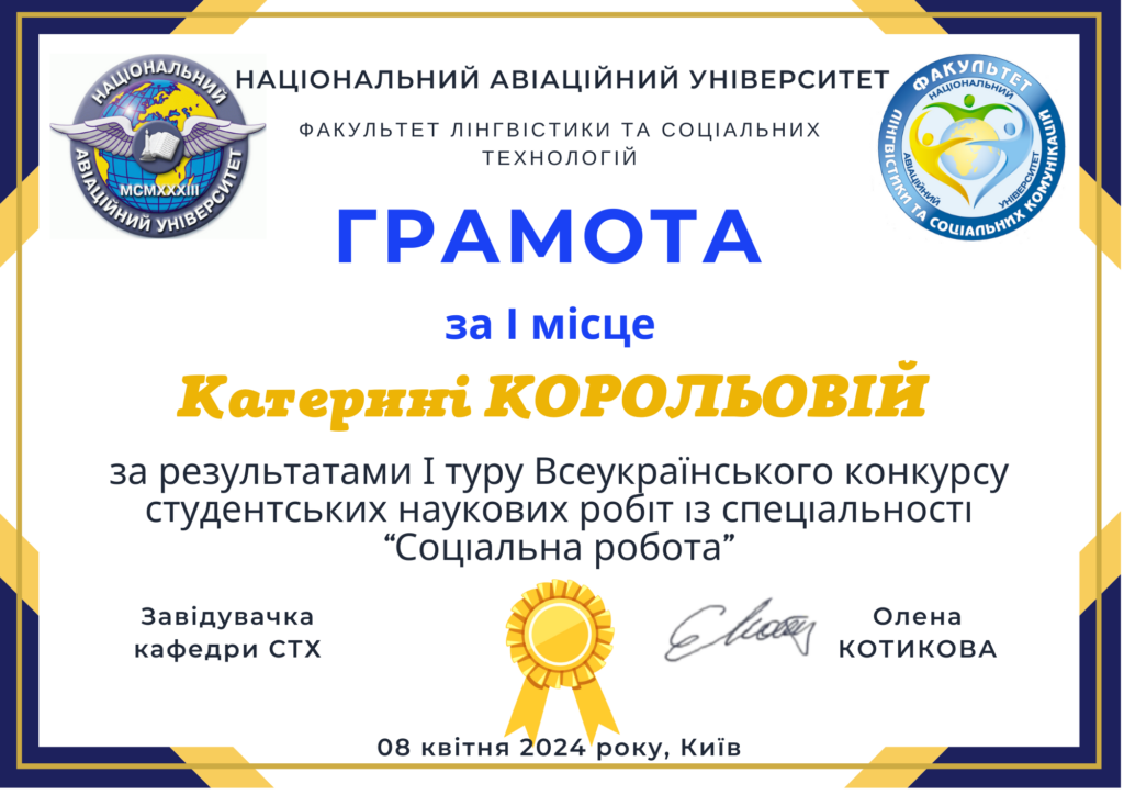 Перше місце було присуджено Катерині Корольовій (науковий керівник: професор, доктор психологічних наук Блінов Олег Анатолійович), за роботу на тему “Сутність та засоби соціальної роботи з військовослужбовцями“, яка висвітлила важливі аспекти підтримки військовослужбовців у сучасних умовах.