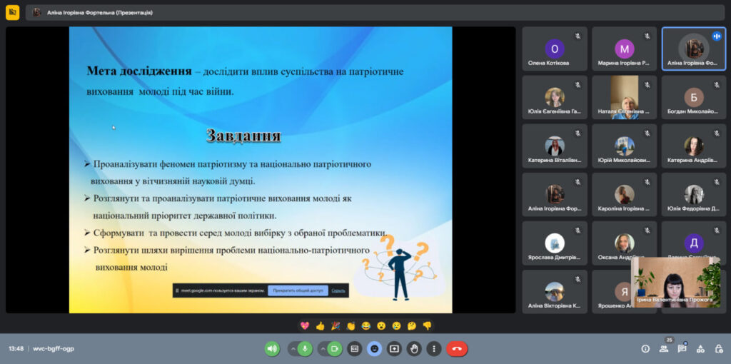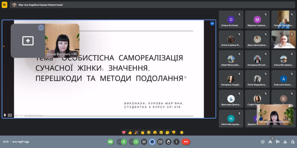 Друге місце зайняла Мар’яна Курова з дослідженням “Особистісна самореалізація сучасної жінки: значення, перешкоди та методи подолання” (науковий керівник: старший викладач кафедри Новікова Наталя Євгенівна), яке акцентувало увагу на важливості самореалізації жінок у суспільстві.