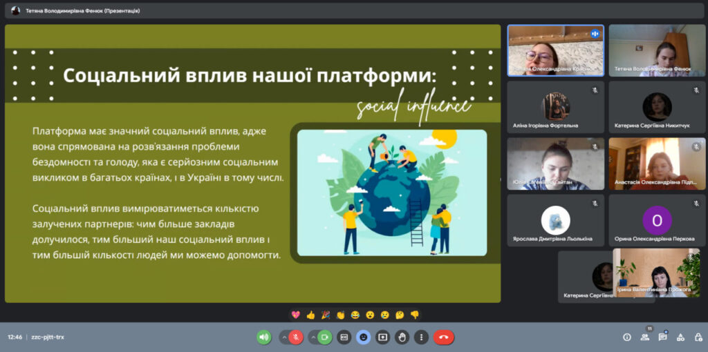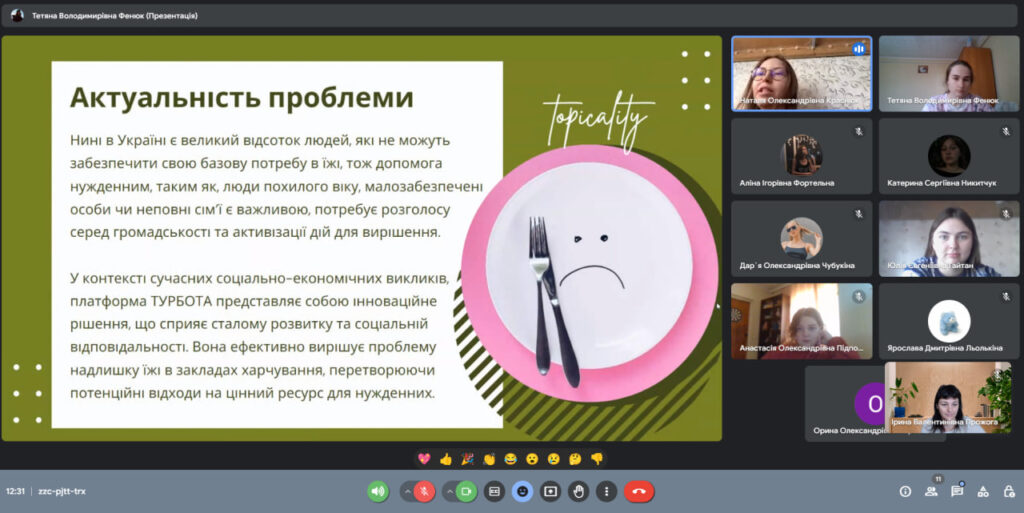 Проєкт “Турбота”- платформа для розподілу їжі серед нужденних” (Краснюк Наталя, Фенюк Тетяна), і “Відновлення: мережа допомоги для ментального здоров’я” (Никитчук Катерина) засвідчили, що студенти готові вирішувати нагальні соціальні проблеми через технологічні нововведення. Також, “Розробка концепту соціального підприємства трапезної-кавярні “Агапа”” (Галка Софія, Раздобреєва Олександра), демонструє як можна ефективно поєднувати бізнес з соціальними місіями, “Катарсис: кімната-антистрес” (Ткаченко Іван), створює місце, де кожен може фізично вивільнити стрес через руйнування предметів, особливо важливе для військових.
