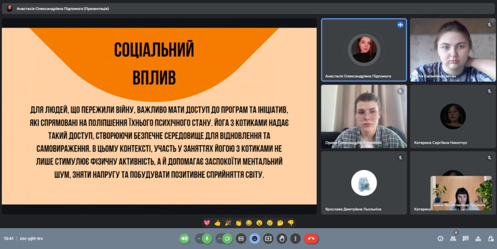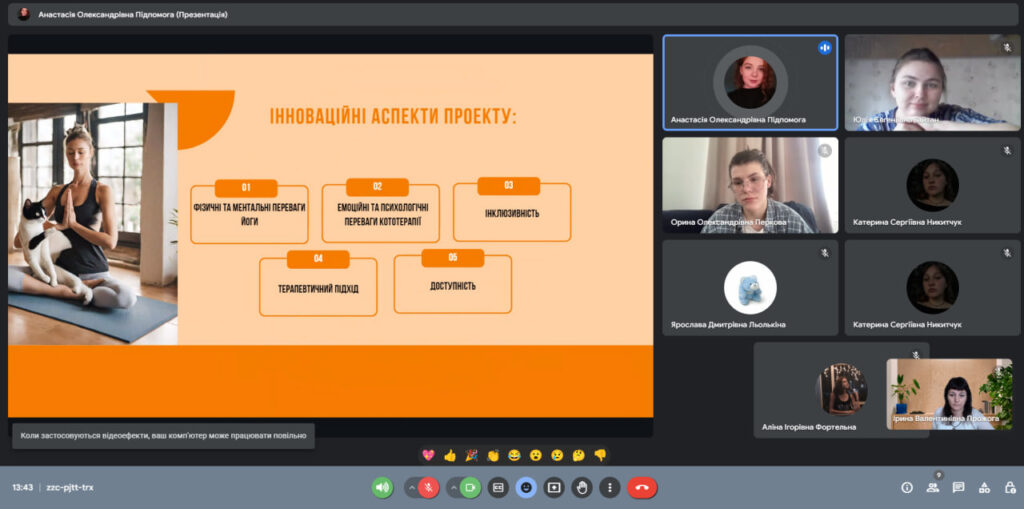 Серед захищених проєктів були такі перлини інноваційного мислення, як “ReArt: меблі з минулим” (Гайтан Юлія, Лісничий Владислав), який пропонує нове життя старим речам, та “Парк пам’яті” (Перкова Орина, Льолькіна Ярослава), який створює простір для рефлексії та вшанування. “Йога з котиками для людей, що стикнулись з наслідками війни” (Підпомога Анастасія), привнесла надзвичайно зворушливий елемент, використовуючи терапію тваринами для психічного відновлення, тоді як “Кавярня-простір ‘Ветеранський куточок'” (Фортельна Аліна, Чубукіна Дар”я) запропонував затишне місце для зустрічей і підтримки ветеранів.