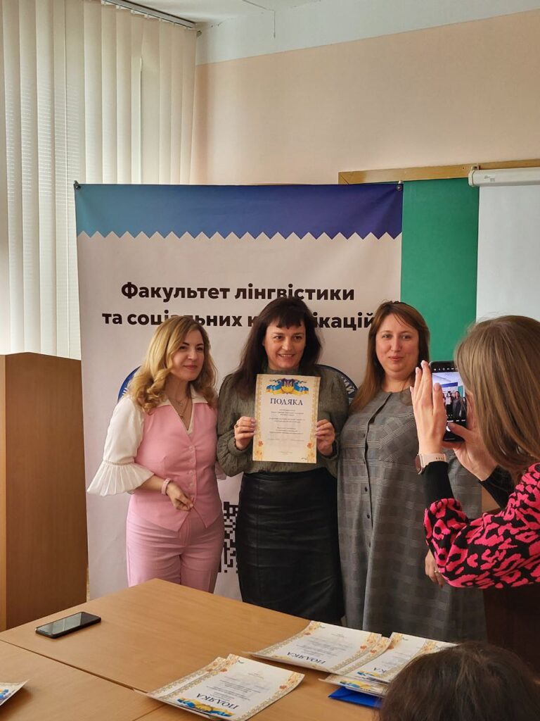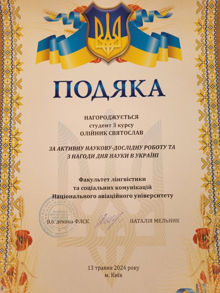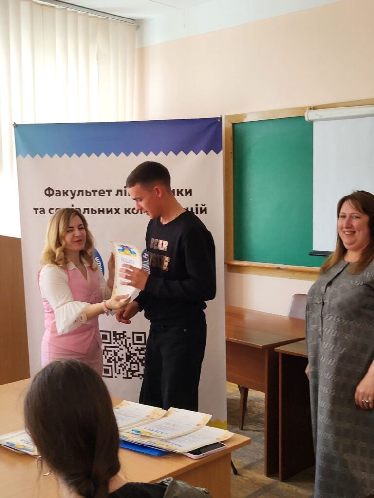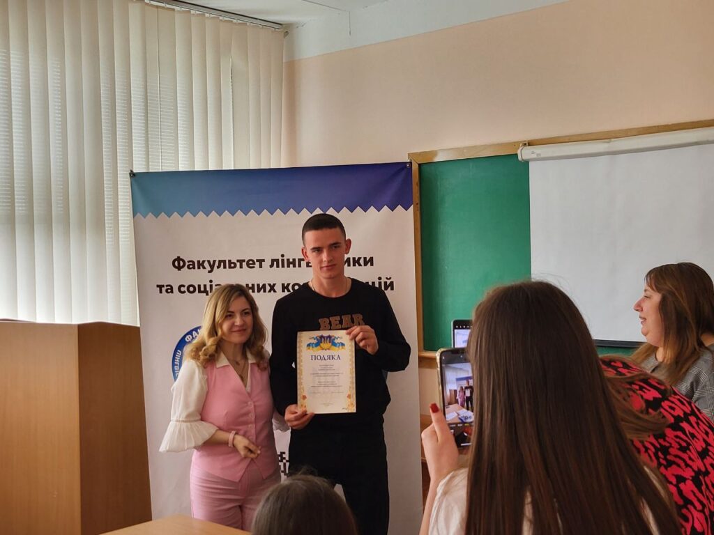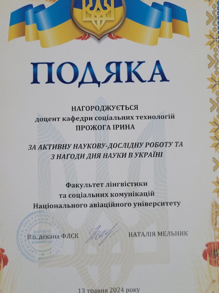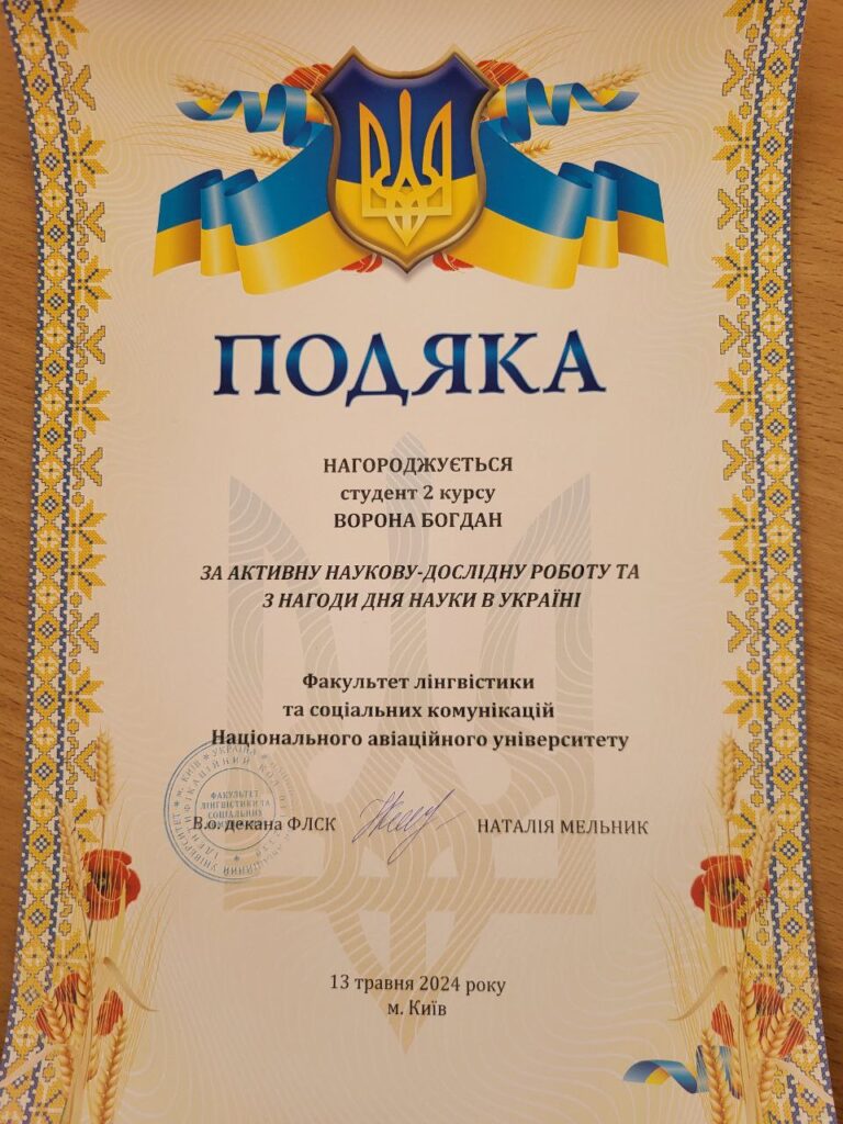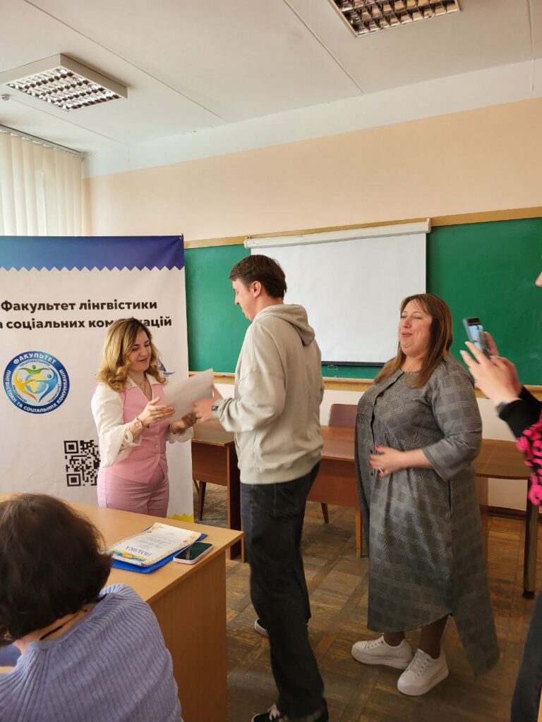 13 травня 2024 року в.о. декана ФЛСК, доктор педагогічних наук, професор Наталя Мельник за активну науково-дослідну роботу з нагоди дня науки нагородила грамотами здобувачів вищої освіти (бакалавр) та доцента кафедри. Ці нагороди є визнанням їх важливого внеску в академічну спільноту та стимулом для подальших досліджень.