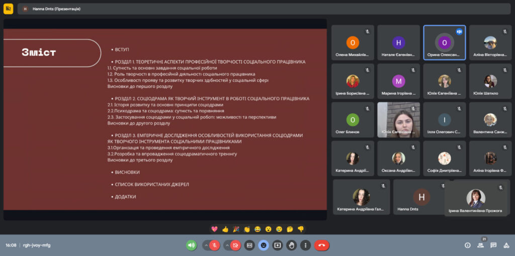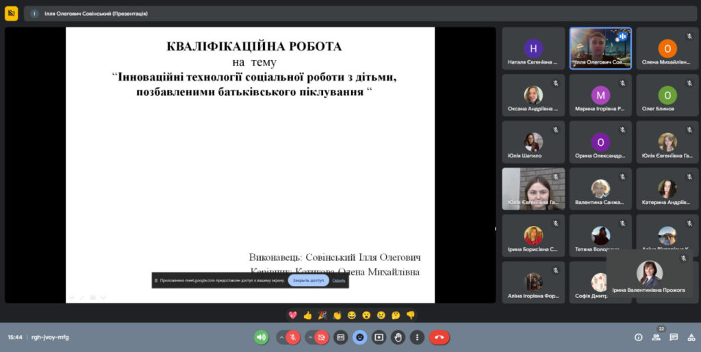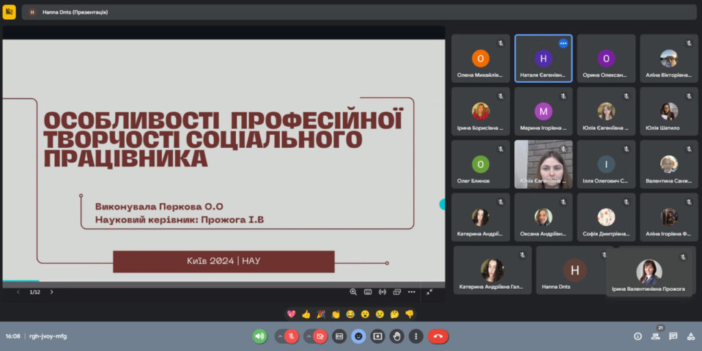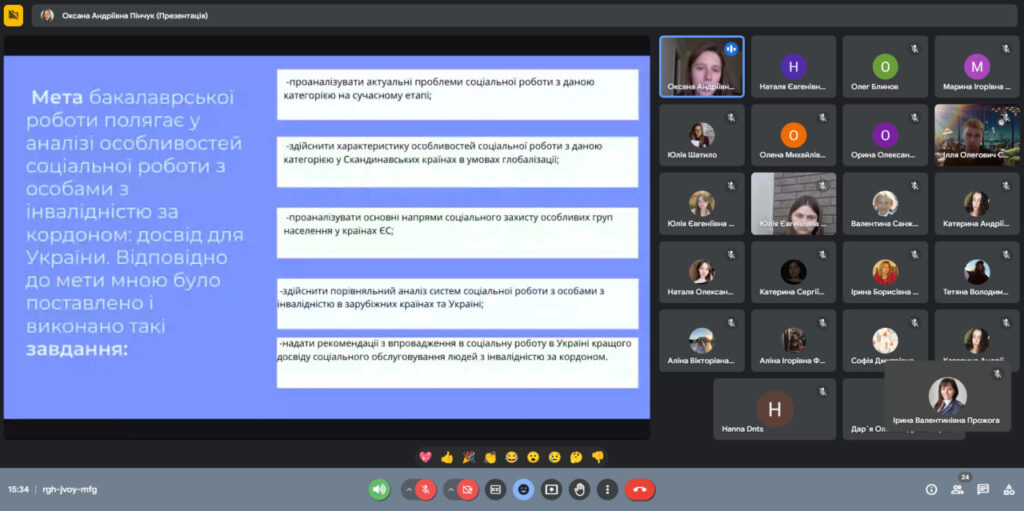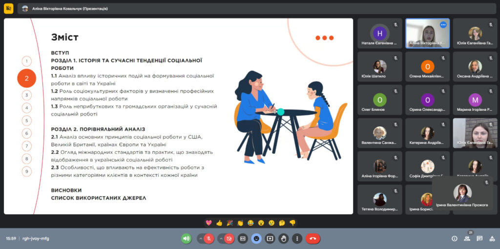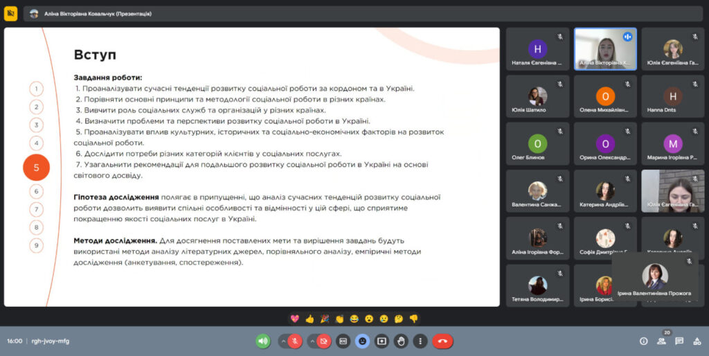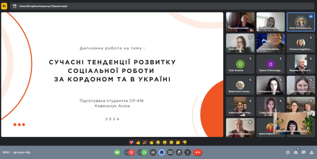 16-17 травня 2024 року на кафедрі соціальних технологій відбувся передзахист кваліфікаційних робіт здобувачів вищої освіти І рівня (бакалавр) за спеціальністю “Соціальна робота”. Студенти представили інноваційні дослідження, які вносять значний вклад у розвиток цієї галузі. Їхні роботи охоплюють різноманітні аспекти соціальної роботи, включаючи новітні методики соціальної підтримки, ефективні стратегії взаємодії з різними соціальними групами та нові підходи до вирішення актуальних соціальних проблем.