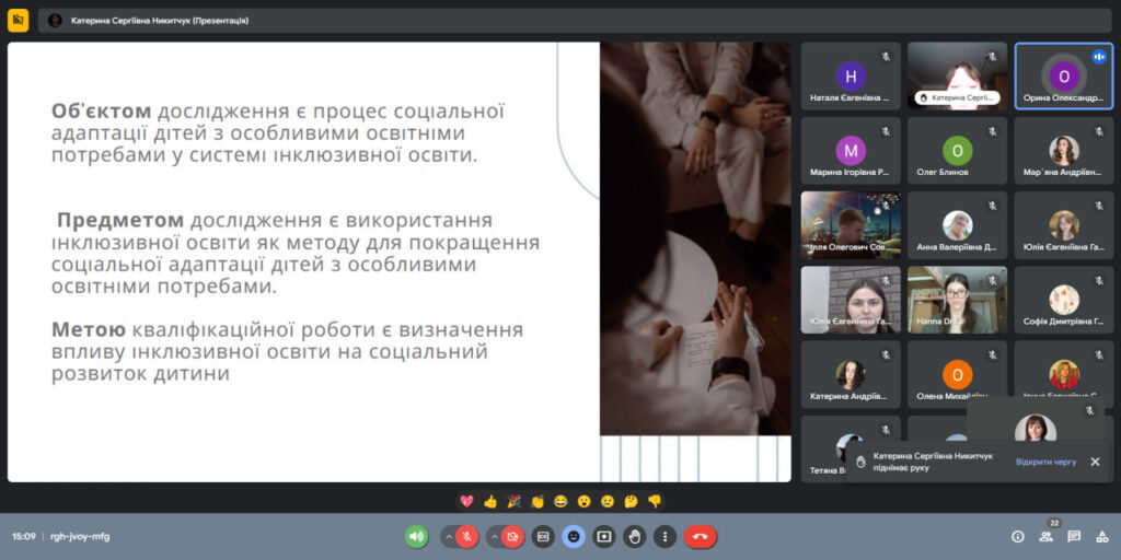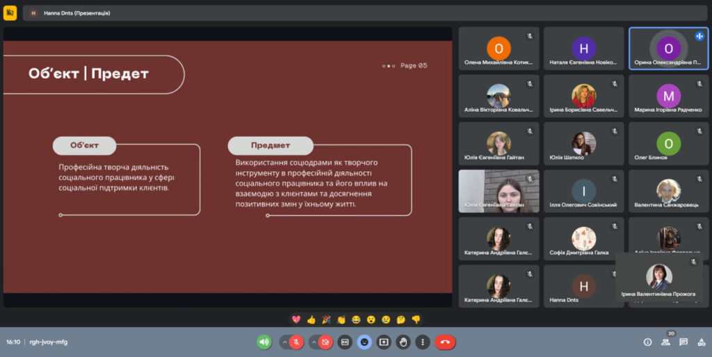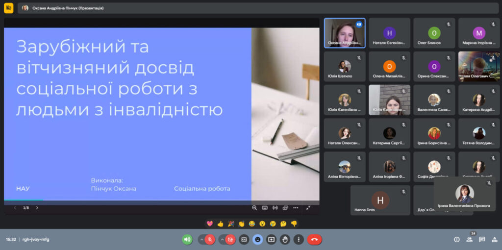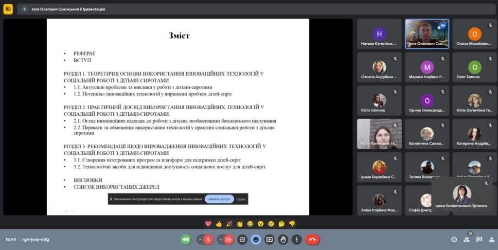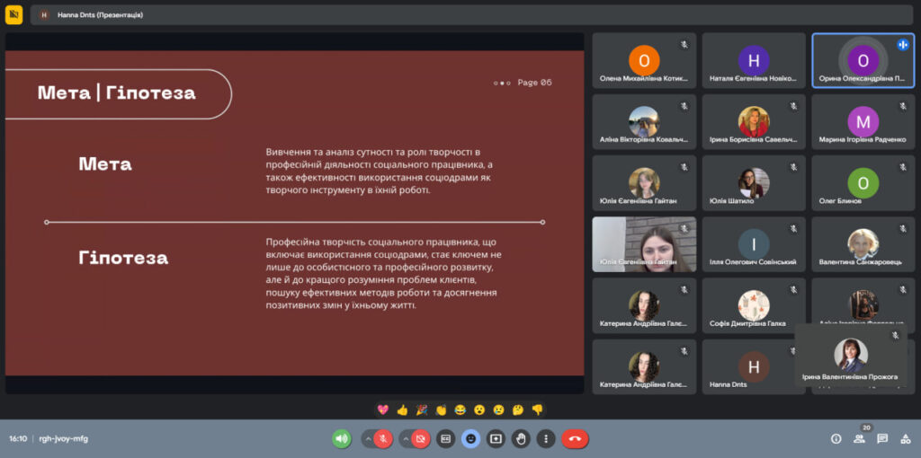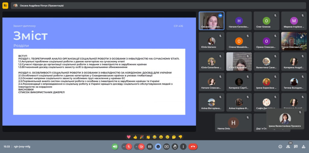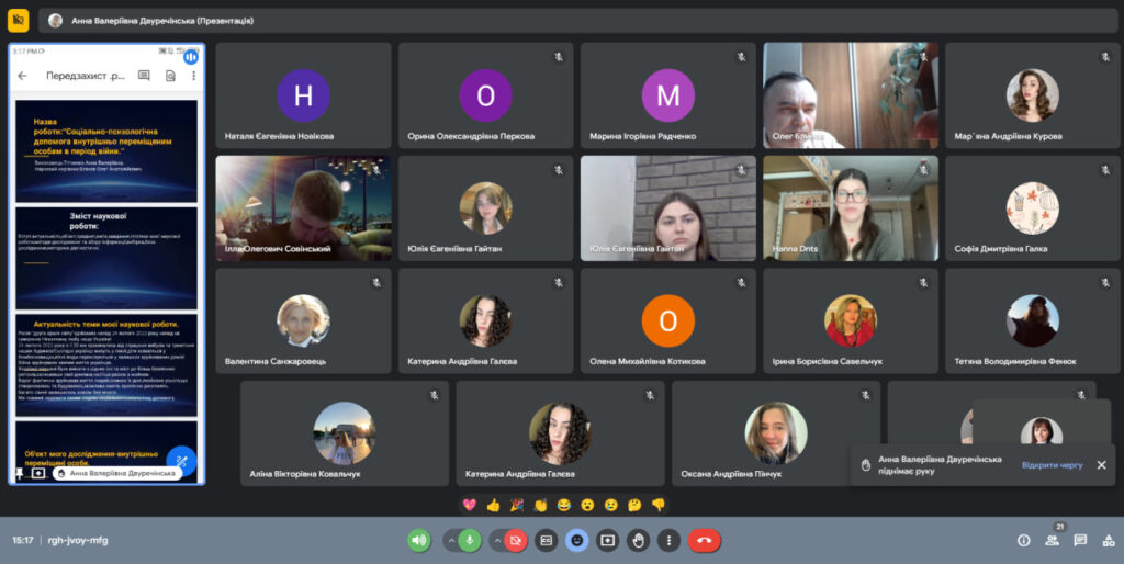 16-17 травня 2024 року на кафедрі соціальних технологій відбувся передзахист кваліфікаційних робіт здобувачів вищої освіти І рівня (бакалавр) за спеціальністю “Соціальна робота”. Студенти представили інноваційні дослідження, які вносять значний вклад у розвиток цієї галузі. Їхні роботи охоплюють різноманітні аспекти соціальної роботи, включаючи новітні методики соціальної підтримки, ефективні стратегії взаємодії з різними соціальними групами та нові підходи до вирішення актуальних соціальних проблем.