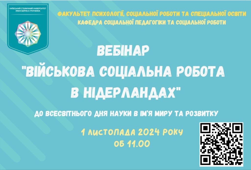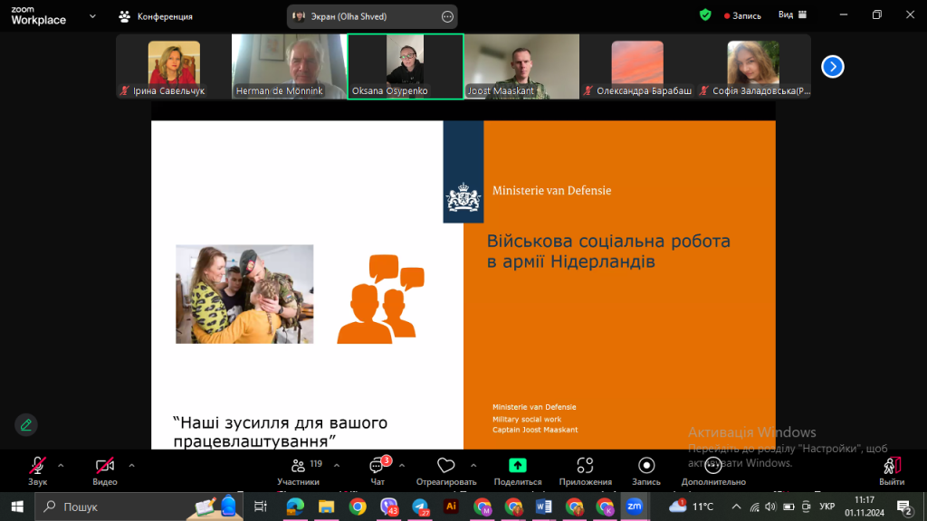 1 листопада 2024 року викладачі кафедри соціальної роботи та реабілітації взяли участь у вебінарі «Військова соціальна робота в Нідерландах», що став важливим майданчиком для обміну досвідом у галузі підтримки військовослужбовців та їхніх сімей. Учасники мали змогу ознайомитися з передовими підходами до військової соціальної роботи, які практикуються в Нідерландах, зокрема з методами реабілітації ветеранів, програмами психологічної підтримки та інтеграції військових у суспільство після завершення служби.