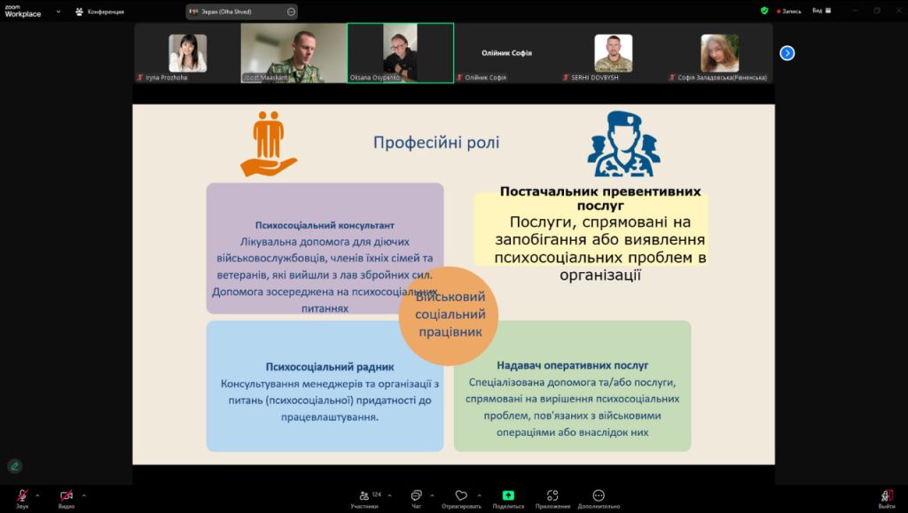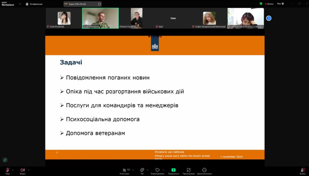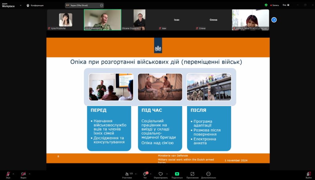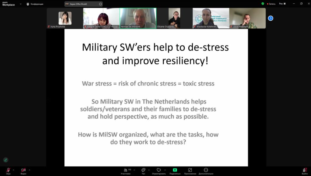 Під час вебінару нідерландські експерти поділилися практичними рекомендаціями та кейсами щодо роботи з військовими, зокрема щодо кризового консультування, підтримки посттравматичних станів та соціальної адаптації військовослужбовців. Викладачі кафедри активно долучалися до обговорень, ставили питання та отримали нові знання, що стануть цінним доповненням до освітнього процесу та допоможуть розширити професійні компетенції у сфері військової соціальної роботи.