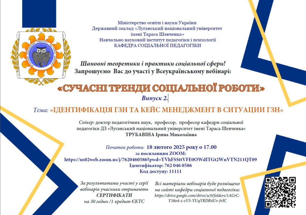 18 лютого 2025 року відбувся Всеукраїнський вебінар «Сучасні тренди соціальної роботи», присвячений Темі 2: «Ідентифікація ГЗН та кейс-менеджмент в ситуації ГЗН».