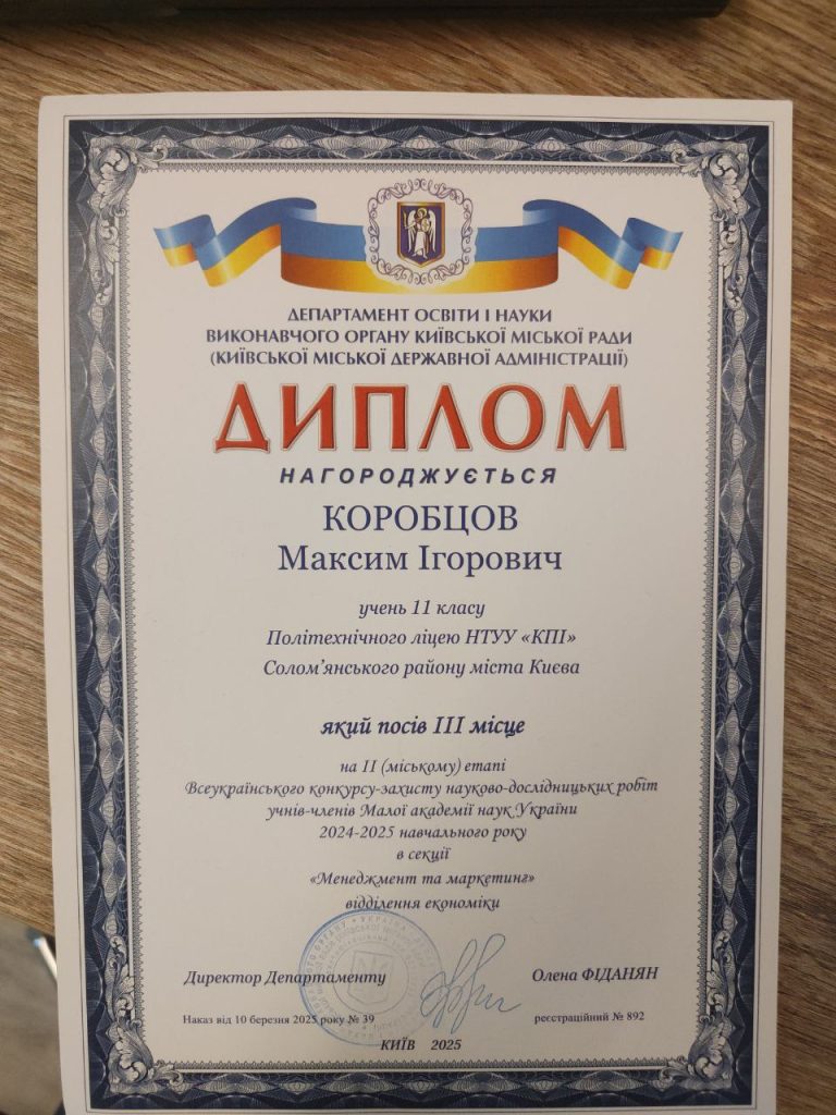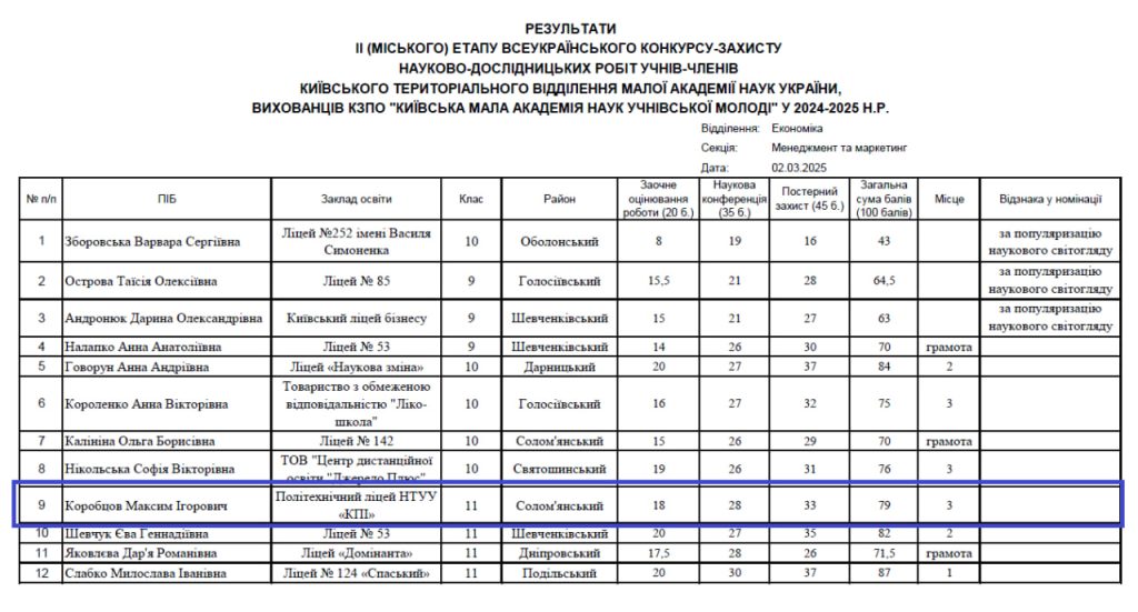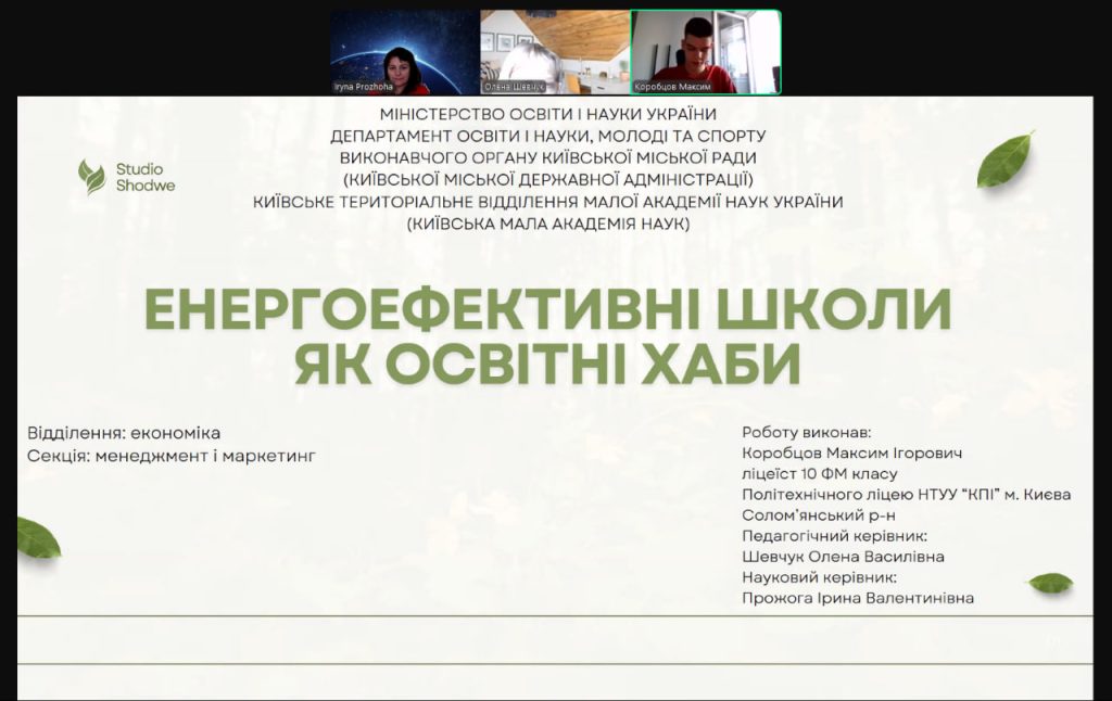 Під її наставництвом Коробцов Максим, учень 11 класу Політехнічного ліцею НТУУ “КПІ”, 02.03.2025р. виборов ІІІ місце у секції “Менеджмент та маркетинг”, успішно представивши своє дослідження на тему “Енергоефективні школи як освітні хаби”. Його робота присвячена важливим питанням сталого розвитку, інноваційним технологіям у сфері енергозбереження та їхньому впливу на освітній простір.