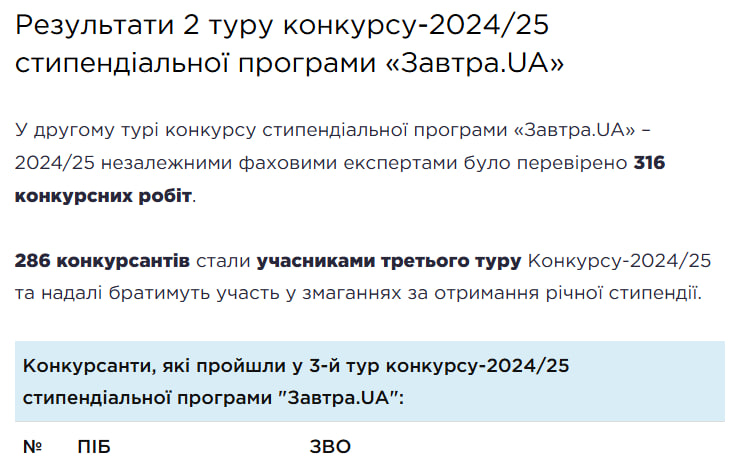 Вітаємо здобувачів вищої освіти за спеціальністю “Соціальна робота”, які стали учасниками III туру Конкурсу стипендіальної програми «Завтра.UA» 2024/25, успішно подолаючи ІІ етап та зможуть далі змагатися за річну стипендію серед 286 конкурсантів з різних ЗВО.