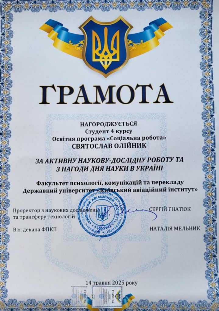 🔹 Олійник Святослав — здобувач вищої освіти першого (бакалаврського) рівня.