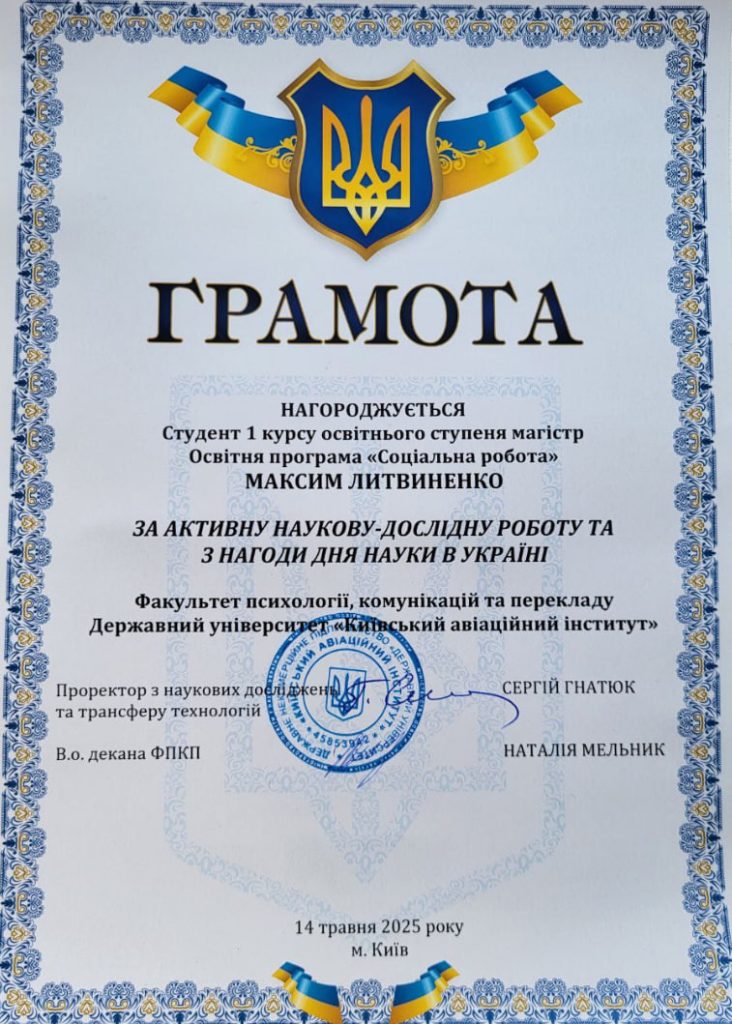 🔹 Литвиненко Максим — здобувач вищої освіти другого (магістерського) рівня;