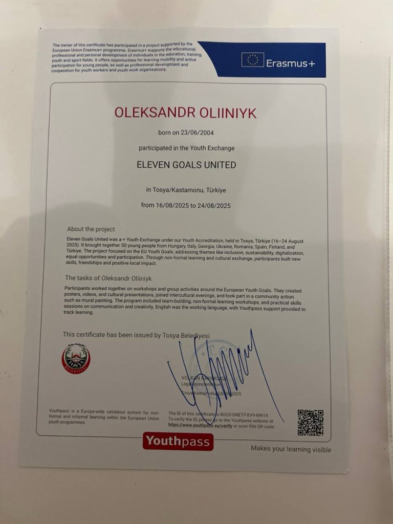 Здобувач першого (бакалаврського) рівня вищої освіти Олійник Олександр успішно взяв участь у міжнародному молодіжному обміні програми Erasmus+, що відбувся у період з 16 по 24 серпня 2025 року в місті Тосья, провінція Кастамону, Туреччина.