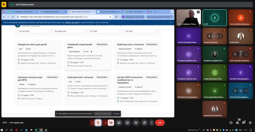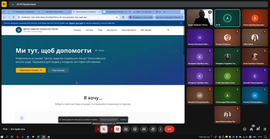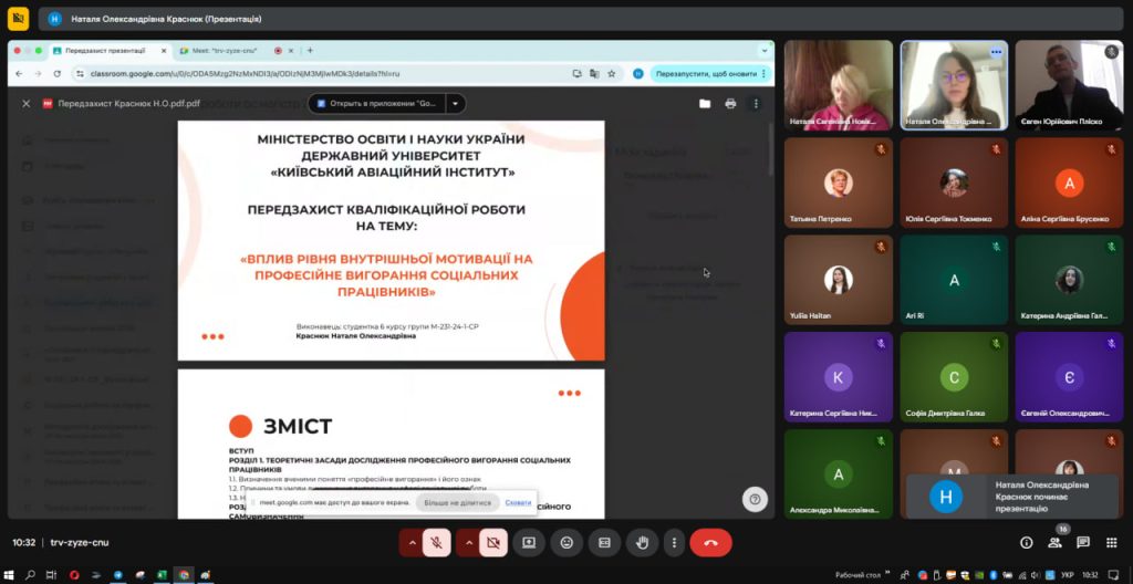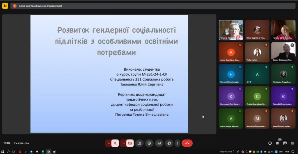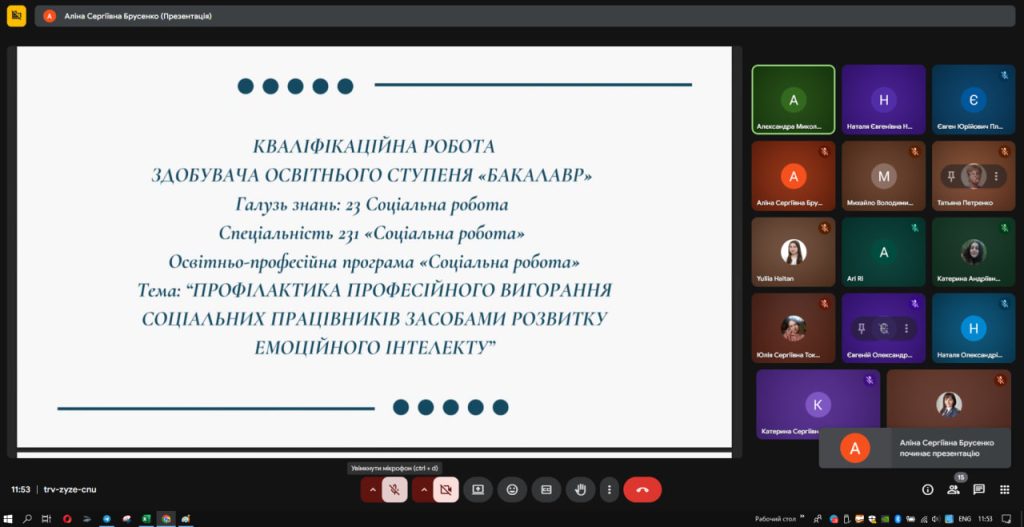 Під час передзахисту були представлені роботи на актуальні теми сьогодення: адаптація ветеранів війни до мирного життя, використання цифрових технологій у соціальній роботі з внутрішньо переміщеними особами як механізм соціальної адаптації, розвиток соціального підприємництва як засобу підтримки ветеранів і переселенців, а також інші важливі напрями сучасної соціальної практики.