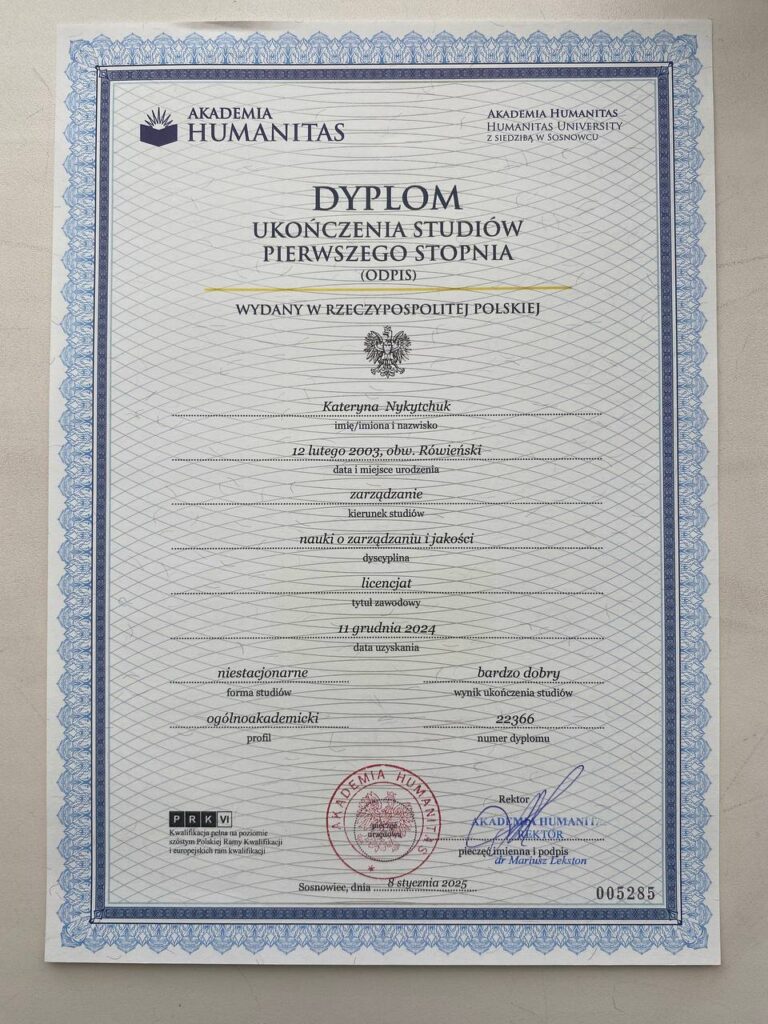 Важливою складовою її академічної траєкторії стало паралельне навчання в університеті Humanitas University (Польща), що засвідчує високий рівень мотивації, академічної мобільності та орієнтацію на європейські освітні стандарти. Такий формат навчання дає змогу поєднувати український і міжнародний освітній досвід, формувати міжкультурні компетентності та розширювати професійні горизонти майбутніх фахівців.