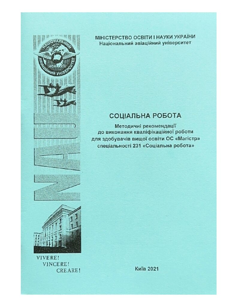 Соціальна робота: методичні рекомендації до виконання кваліфікаційної роботи / уклад.: О. М. Котикова, О. А. Блінов, І. Ф. Тімкін, Н. Є. Новікова – К.: НАУ, 2021. – 44 с. Методичні рекомендації містять вимоги до структури, змісту, обсягу та порядку виконання кваліфікаційних робіт ОС «Магістр». Для здобувачів вищої освіти ОС «Магістр» спеціальності 231 «Соціальна робота»