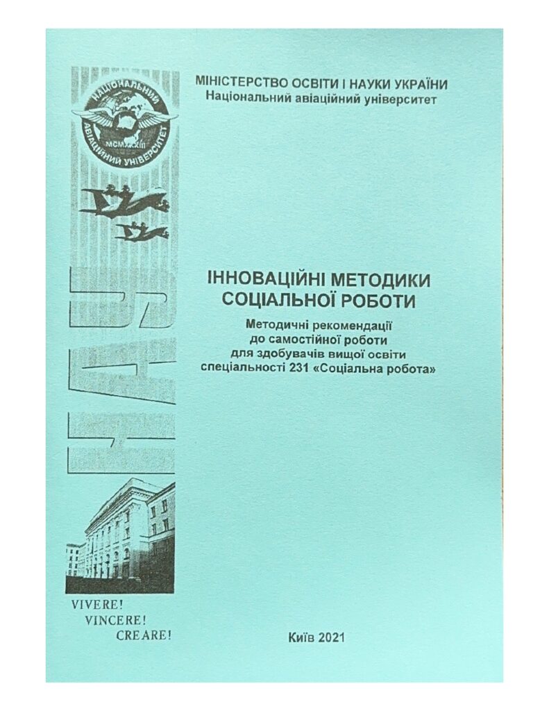Інноваційні методики соціальної роботи : методичні рекомендації до самостійної роботи / уклад. : О. М. Котикова, М. І. Радченко. – К. : НАУ, 2021. – 80 с. Видання включає перелік лекційних тем до модулів, матеріали для практичних занять, питання для контролю і самоконтролю, тематику рефератів, методичні рекомендації щодо організації самостійної роботи студентів, глосарій, список літератури. Для здобувачів вищої освіти спеціальності 231 «Соціальна робота».