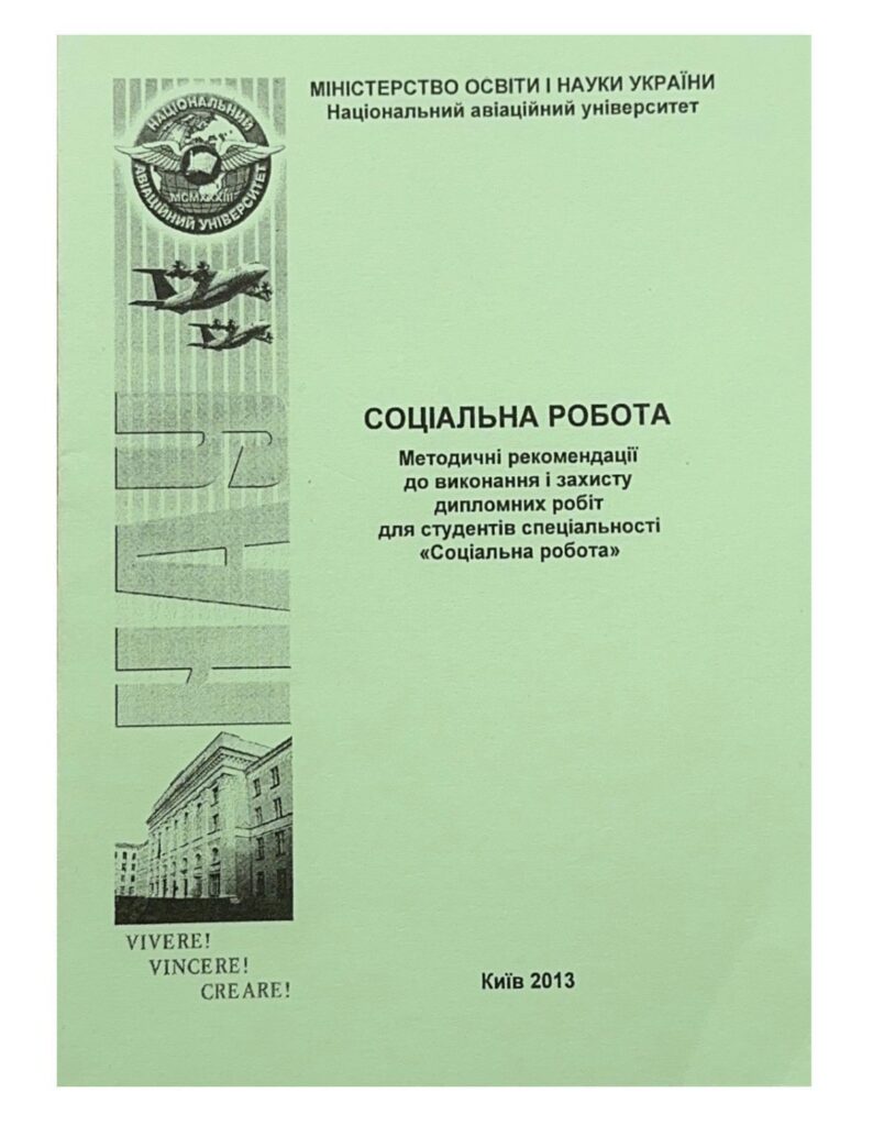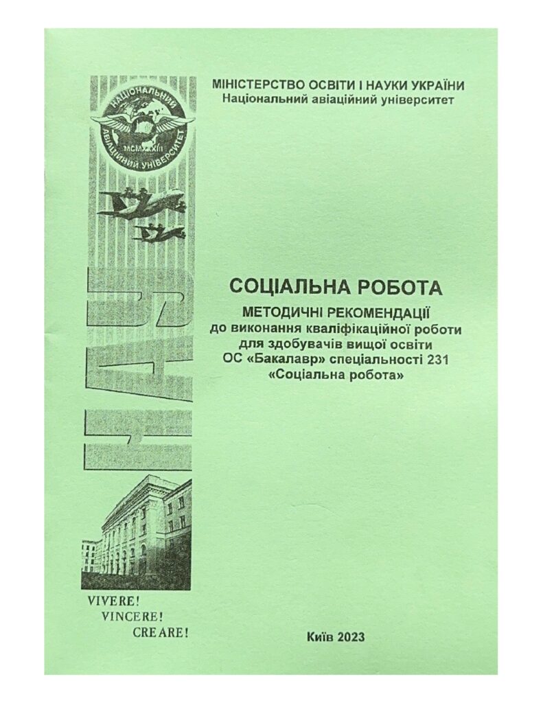 Соціальна робота: методичні рекомендації до виконання кваліфікаційної роботи / уклад.: О. М. Котикова, О. А. Блінов, І. Ф. Тімкін, Н. Є. Новікова – К. : НАУ, 2023. – 36 с. Містять вимоги до структури, змісту, обсягу та порядку виконання кваліфікаційних робіт. Для здобувачів вищої освіти ОС «Бакалавр» спеціальності 231 «Соціальна робота»