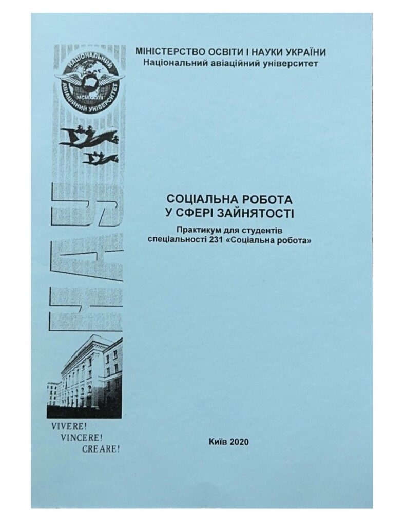 Соціальна робота у сфері зайнятості. Практикум для студентів спеціальності 231 «Соціальна робота». Укл. Петренко Т.В., Санжаровець В.М., Шатило Ю.П. К: НАУ, 2020. – 75 с. Видання містить перелік питань до кожної теми, матеріали для практичних занять, завдання для самоконтролю, тематику рефератів до кожної теми, практичні поради щодо організації самостійної роботи студентів, список літератури. Для студентів спеціальності 231 «Соціальна робота».