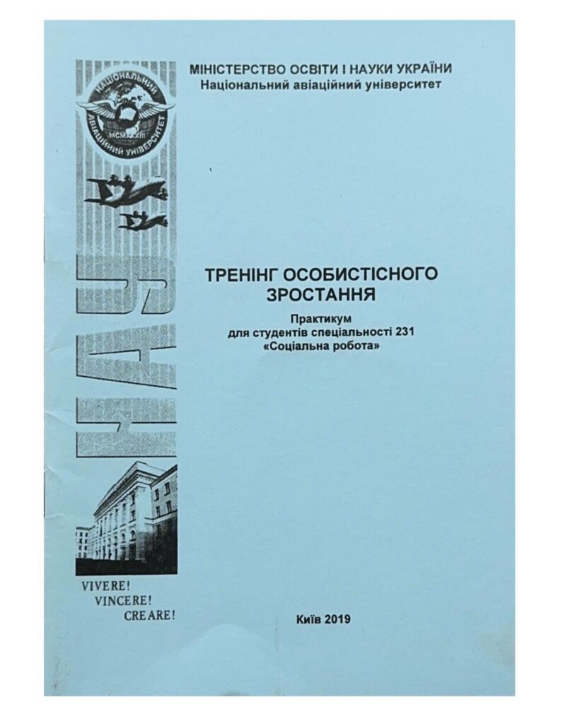 Тренінг особистісного зростання: практикум / Ю. П. Шатило. – К.: НАУ, 2019. – 44 с. Видання містить перелік питань до кожної теми, матеріали для практичних занять, завдання для самоконтролю, тематику рефератів до кожної теми, практичні поради щодо організації самостійної роботи студентів, список літератури. Для студентів спеціальності 231 «Соціальна робота»
