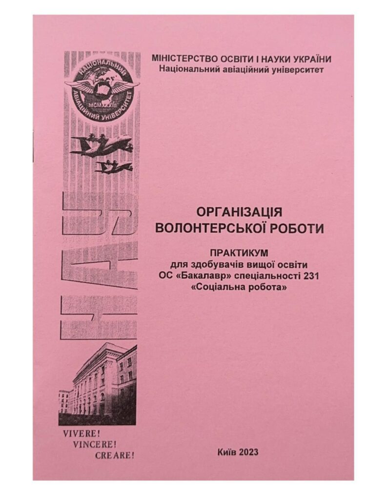 Організація волонтерської роботи: практикум / уклад.: B. М. Санжаровець, Т. В. Петренко, Ю. М. Вовк. – К. : НАУ, 2023. – 48 с..Включає перелік лекційних тем до модулів, матеріали для практичних занять, ситуативні завдання, тематику рефератів, питання для самоконторолю, тестові завдання, модульно-залікові контрольні роботи, список літератури.Для здобувачів вищої освіти ОС «Бакалавр» спеціальності 231 «Соціальна робота».