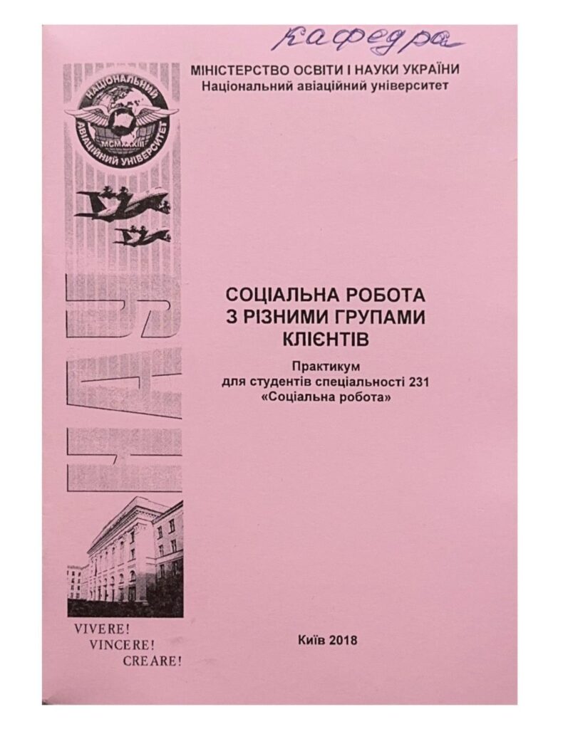 Соціальна робота з різними групами клієнтів: практикум / В. М. Санжаровець. – К. : НАУ, 2018 – 60 с. Видання включає перелік лекційних тем до модуля, матеріали для практичних занять, питання для самоконтролю, тестові завдання, тематику рефератів, методичні рекомендації щодо організації самостійної роботи студентів, список літератури. Для студентів спеціальності 231 «Соціальна робота».