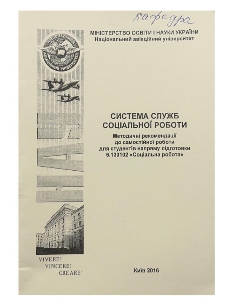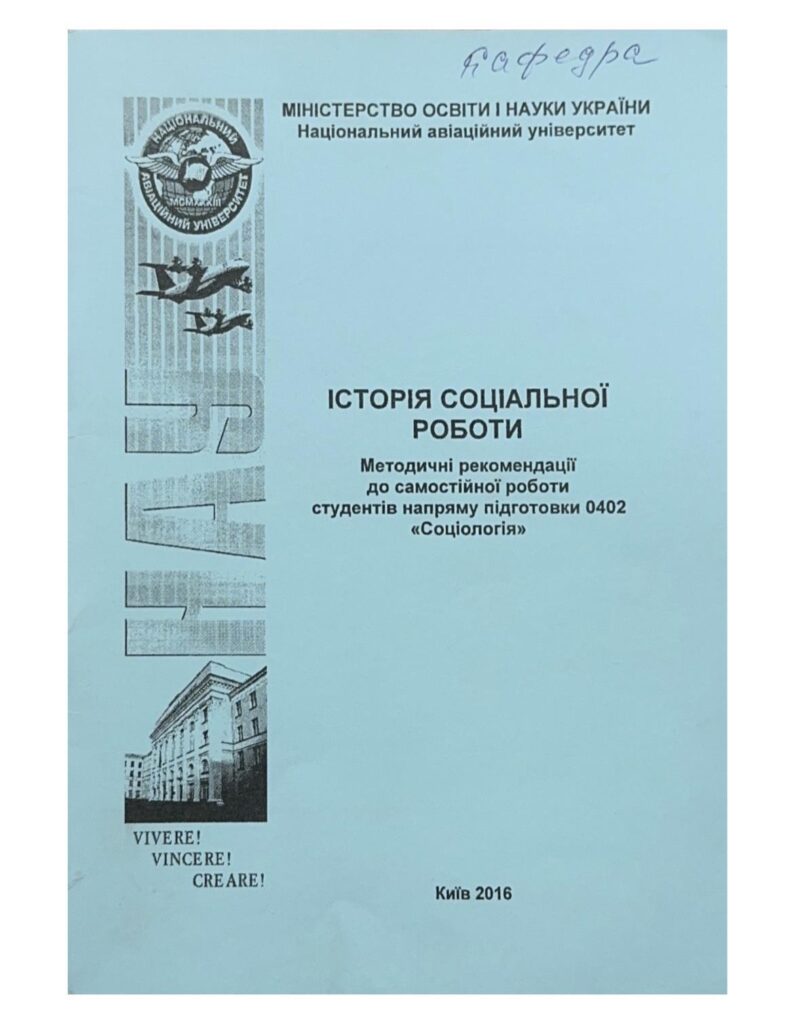 Історія соціальної роботи: методичні рекомендації / уклад. : І. Ф. Тімкін, В. М. Шевченко. – К. : НАУ, 2016. — 60 с. Видання містить методичні рекомендації щодо організації самостійної роботи студентів під час підготовки до лекційних та практичних занять, тестові завдання, список літератури Для студентів напряму підготовки 0402 «Соціологія».
