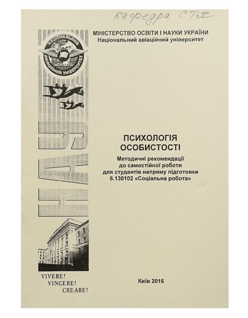 Психологія особистості : методичні рекомендації до самостійної роботи / уклад. О. М. Котикова. – К. : НАУ, 2016. – 48 с.Видання містить матеріали до самостійної роботи, запитання та завдання для самоконтролю, а також список літератури.Для студентів напряму підготовки 6.130102 «Соціальна робота».