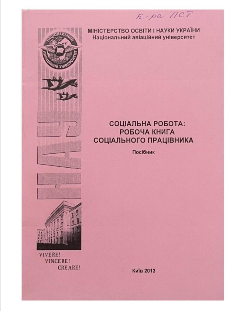 Соціальна робота: Робоча книга соціального працівника : посібник / 0. А. Блінов, М. С. Гурицька, Н. Г. Ісакова [та ін.]. – К. : НАУ, 2013. – 164 с. У посібнику відображено актуальні питання теорії і практики соціальної роботи, її звʼязок з соціальною політикою та правові засади діяльності соціального працівника. Розглянуто соціально-психологічні особливості професійного відбору соціальних працівників, наведено професіограму та психограму професії соціального працівника. Посібник розрахований на студентів вищих навчальних закладів, що навчаються за спеціальністю «Соціальна робота», викладачів та тих, хто практично зайнятий у сфері соціальних послуг та соціального захисту.