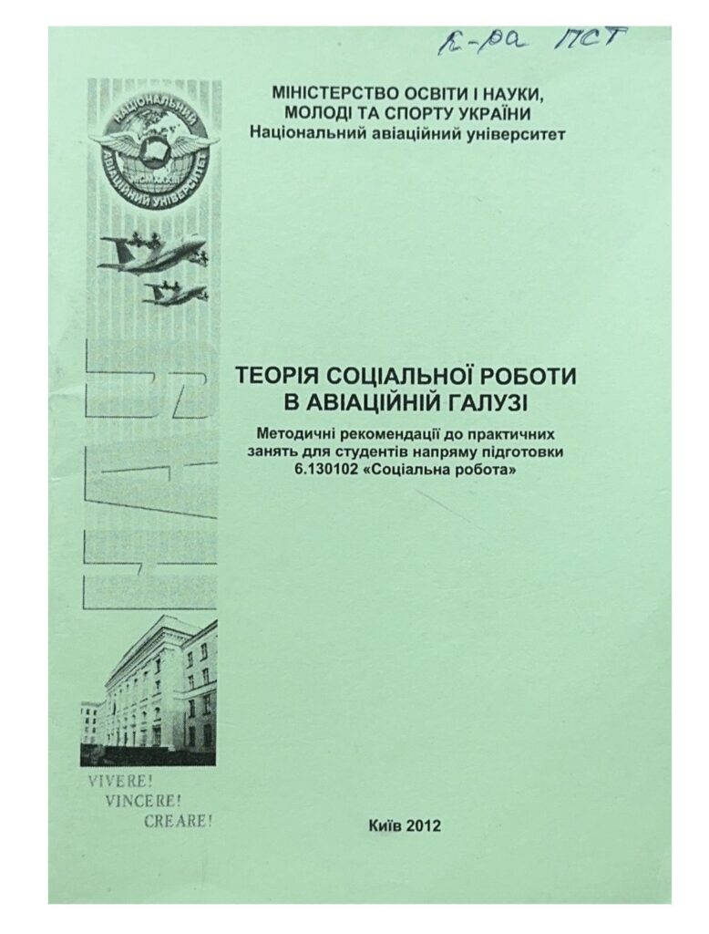 Теорія соціальної роботи в авіаційній галузі : методичні рекомендації до практичних занять / уклад. : О. П. Полисаєв, В. М. Шевченко. – К. : НАУ, 2012. – 60 с. Методичні рекомендації до практичних занять з навчального курсу «Теорія соціальної роботи в авіаційній галузі» зорієнтовані на ознайомлення студентів з питаннями, які підлягають вивченню і обговоренню на практичних заняттях та під час написання контрольних робіт. Подано зокрема теоретичні засади, зміст та організація соціальної роботи в авіаційній галузі. Для студентів напряму підготовки 6.130102 «Соціальна робота».