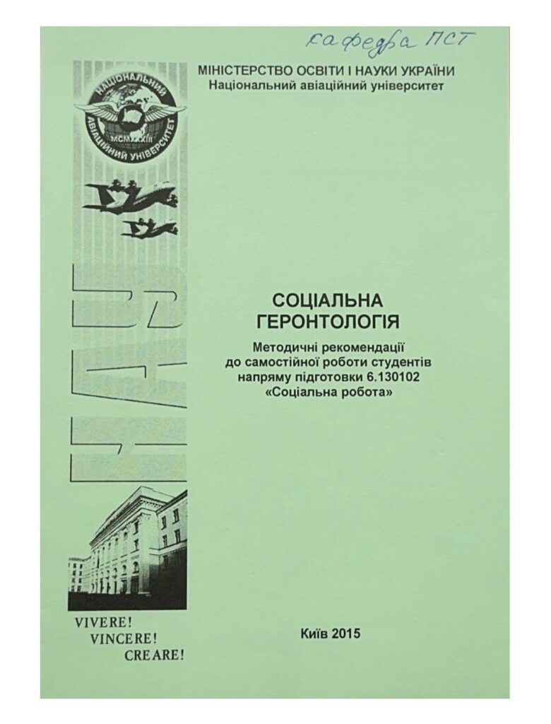 Соціальна геронтологія: методичні рекомендації до самостійної роботи / уклад. Т. В. Петренко. – К. : НАУ, 2015. – 36 с. Видання включає перелік лекційних тем до модуля, матеріали для практичних занять, питання для контролю і самоконтролю, тематику рефератів, методичні рекомендації щодо організації самостійної роботи студентів, список літератури. Для студентів напряму підготовки 6.130102 «Соціальна робота».