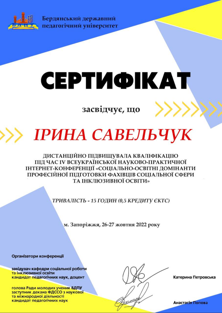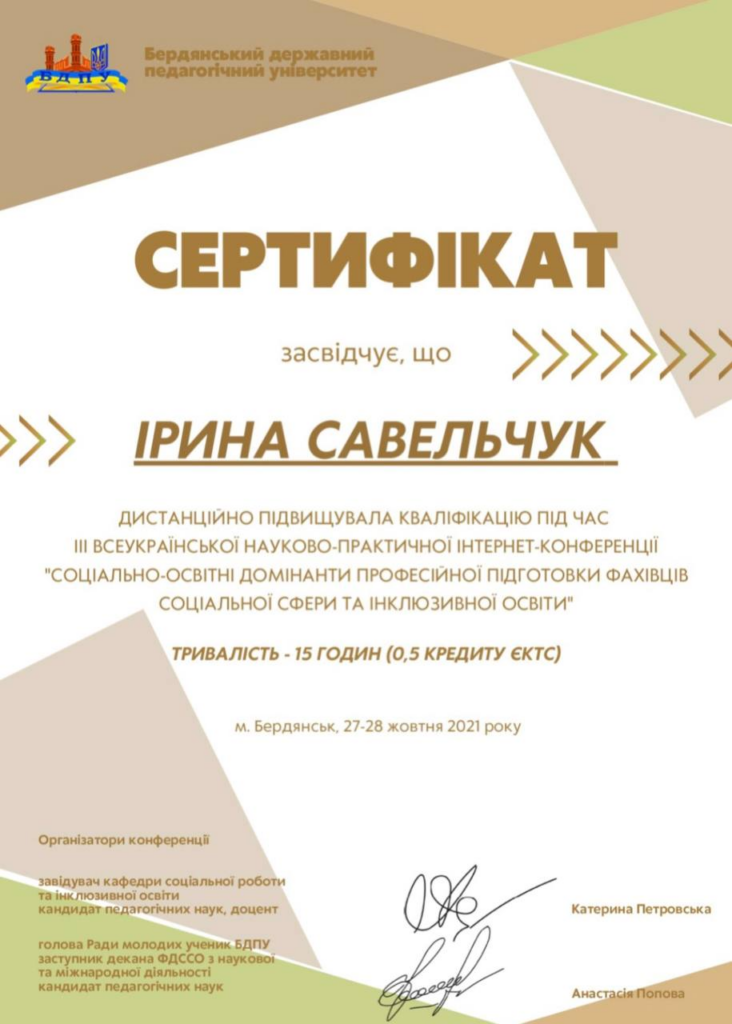 Кафедра соціальної роботи та реабілітації щиро вітає здобувачку вищої освіти І рівня (бакалавр) КОВАЛЬОВУ Софію з перемогою у грантовому конкурсі