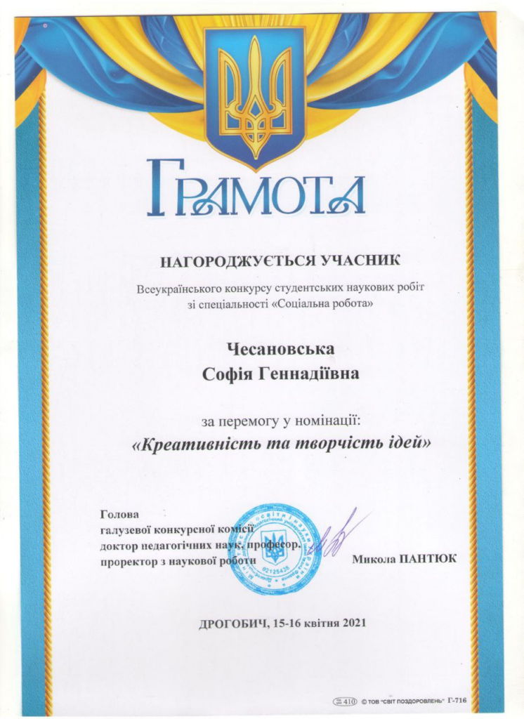 Переможці І-ІІ етапів Всеукраїнського конкурсу студентських наукових робіт у галузі «Соціальна робота», 2021-2022 н.р.:
